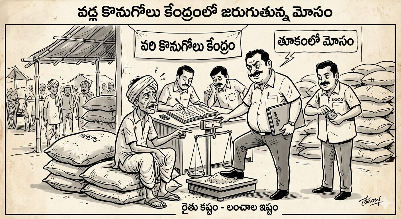 ​ప్రభుత్వ నిబంధనల ప్రకారం బస్తాకు నిర్ణీత బరువు ఉండాలి. కానీ, క్షేత్రస్థాయిలో పరిస్థితి దారుణంగా ఉంది. కొన్ని గ్రామాల్లో 42 కేజీల తూకం వేసి 40 కేజీలుగానే రికార్డు చేస్తున్నారు. మరికొన్ని చోట్ల 37 కేజీలు తూకం వేసి 35 కేజీలుగా చూపిస్తున్నారు. అంటే, ప్రతి బస్తాలో 2 నుండి 5 కిలోల వరకు రైతుల కష్టాన్ని మిల్లర్లు నిస్సిగ్గుగా దోచుకుంటున్నారు.