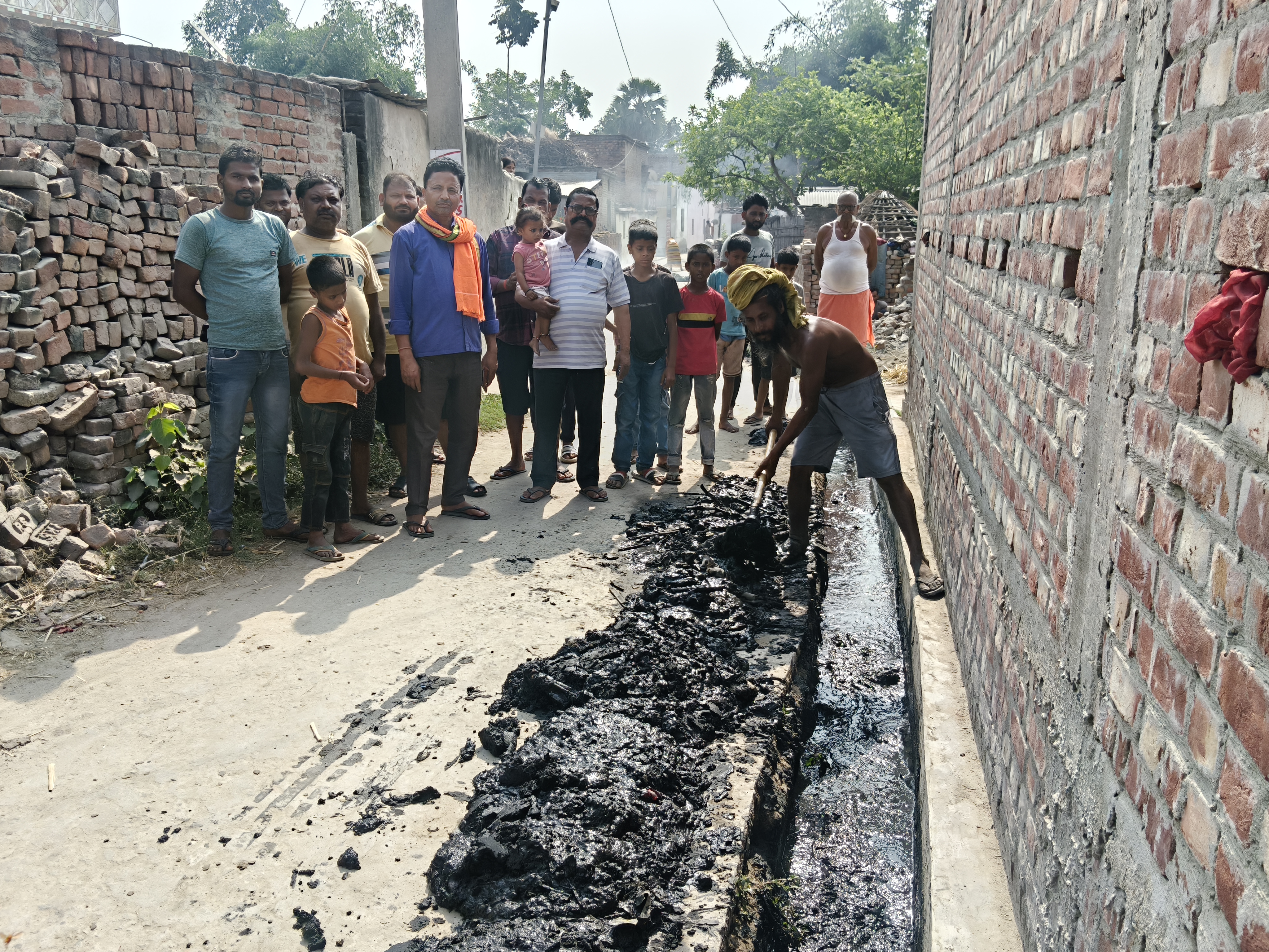 गांव की मुख्य गलियों में बनी नालियों में जमा गाढ़ा काला कचरा, गंदा पानी और मच्छरों का प्रकोप साफ दिख रहा है। तस्वीर में ग्रामीणों के सामने एक मजदूर द्वारा की गई अस्थायी सफाई भी दिखाई दे रही है, जो समस्या की गंभीरता को उजागर करती है।