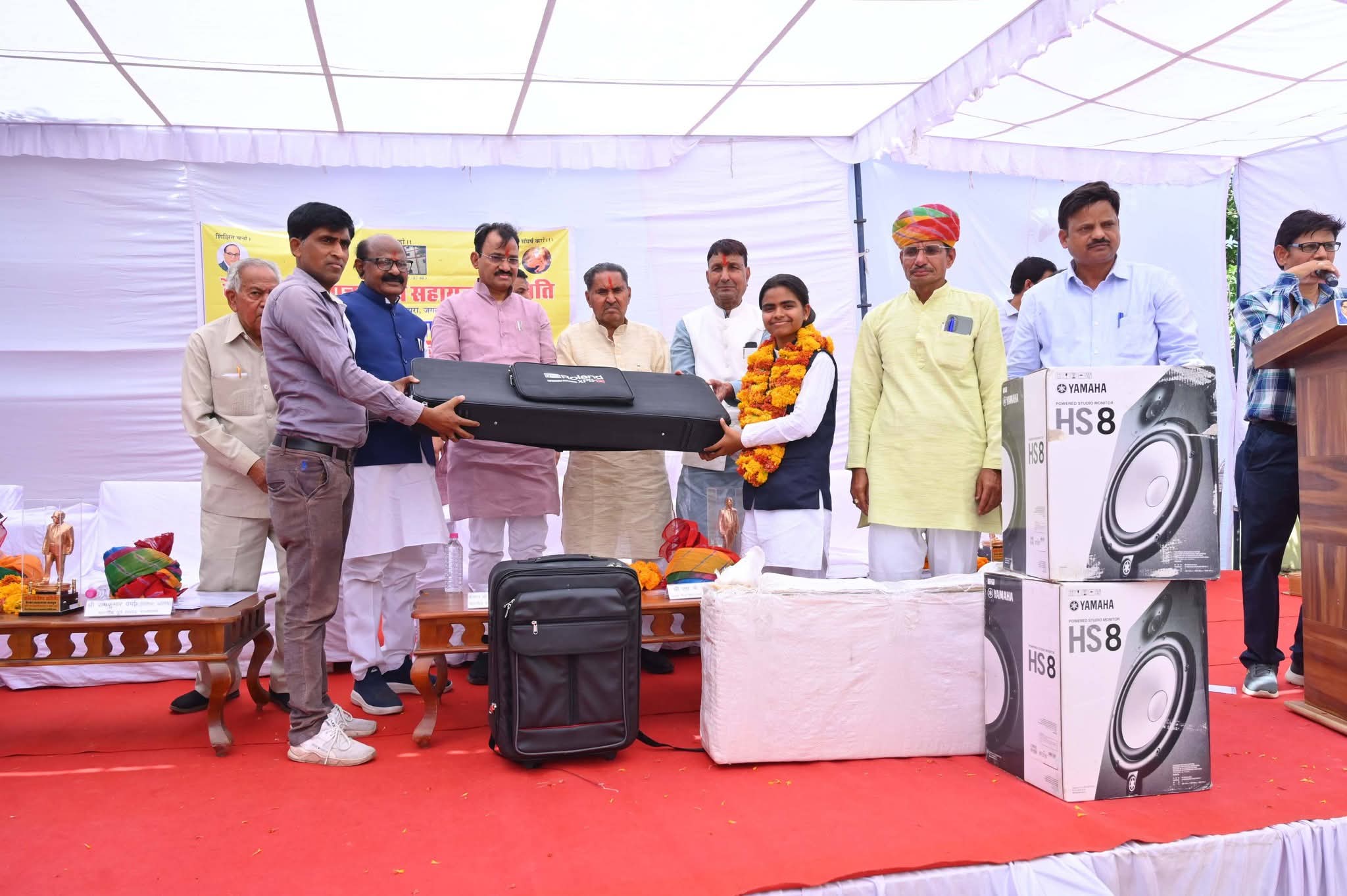 भामाशाहों और सहयोगियों का हुआ सम्मान समारोह में छात्रावास निर्माण में सहयोग देने वाले भामाशाहों और समिति पदाधिकारियों का सम्मान किया गया। मुख्य अतिथि और अन्य अतिथियों ने उन्हें माला पहनाकर एवं स्मृति चिन्ह भेंट कर सम्मानित किया। इसके साथ ही सवाई माधोपुर की नवोदित गायिका रानी बैरवा को उप मुख्यमंत्री द्वारा लगभग 5 लाख रुपये के संगीत उपकरण भेंट किए गए।