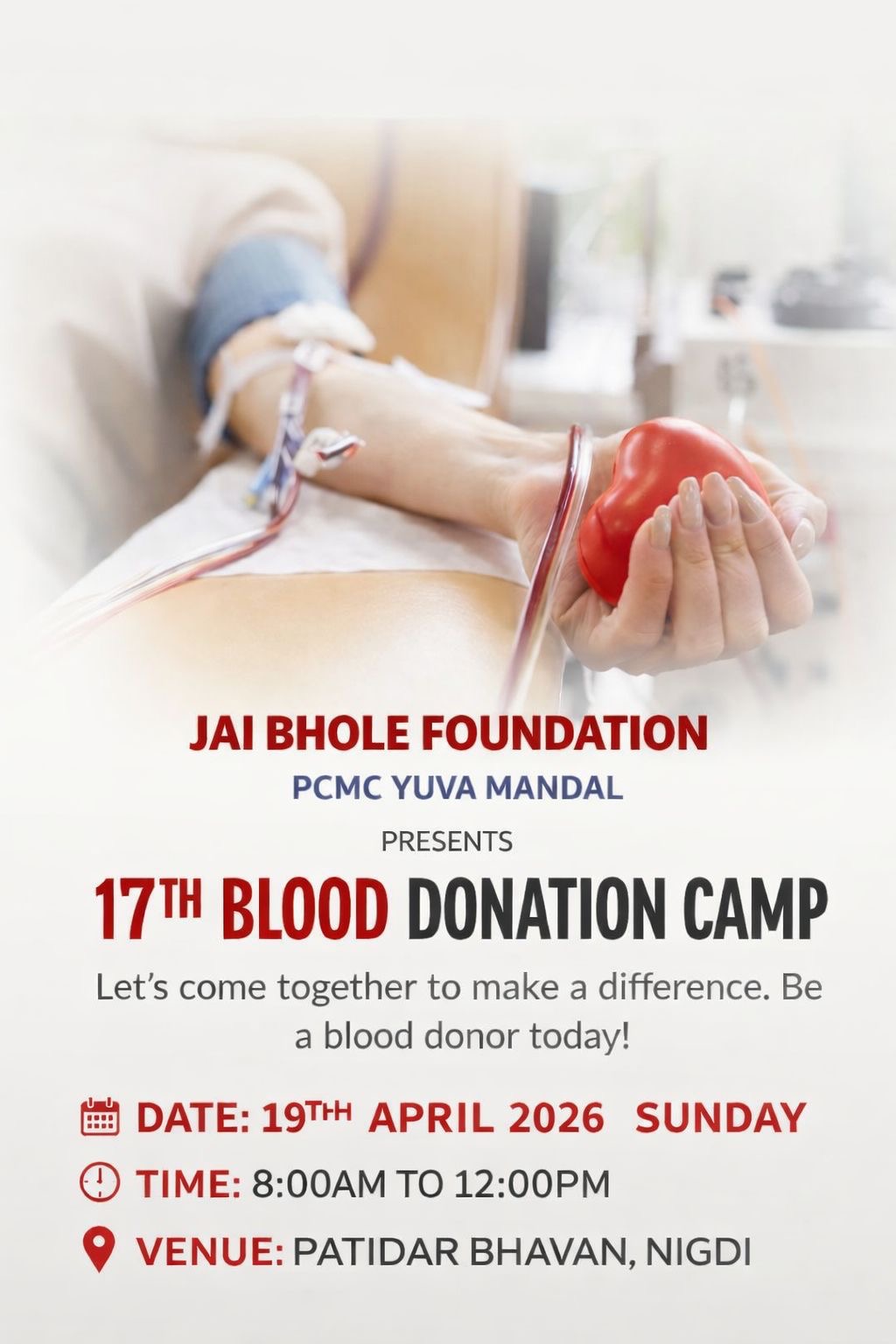 Jai Bhole Foundation and Pimpri Chinchwad Yuva Mandal organized a blood donation camp on 19/04/2026.
