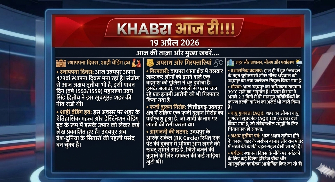 मौसम: आज उदयपुर का अधिकतम तापमान 39°C रहने का अनुमान है। मौसम विभाग ने अगले 2-3 दिनों में प्री-मानसून गतिविधियों के कारण हल्की बारिश का अलर्ट भी जारी किया है।