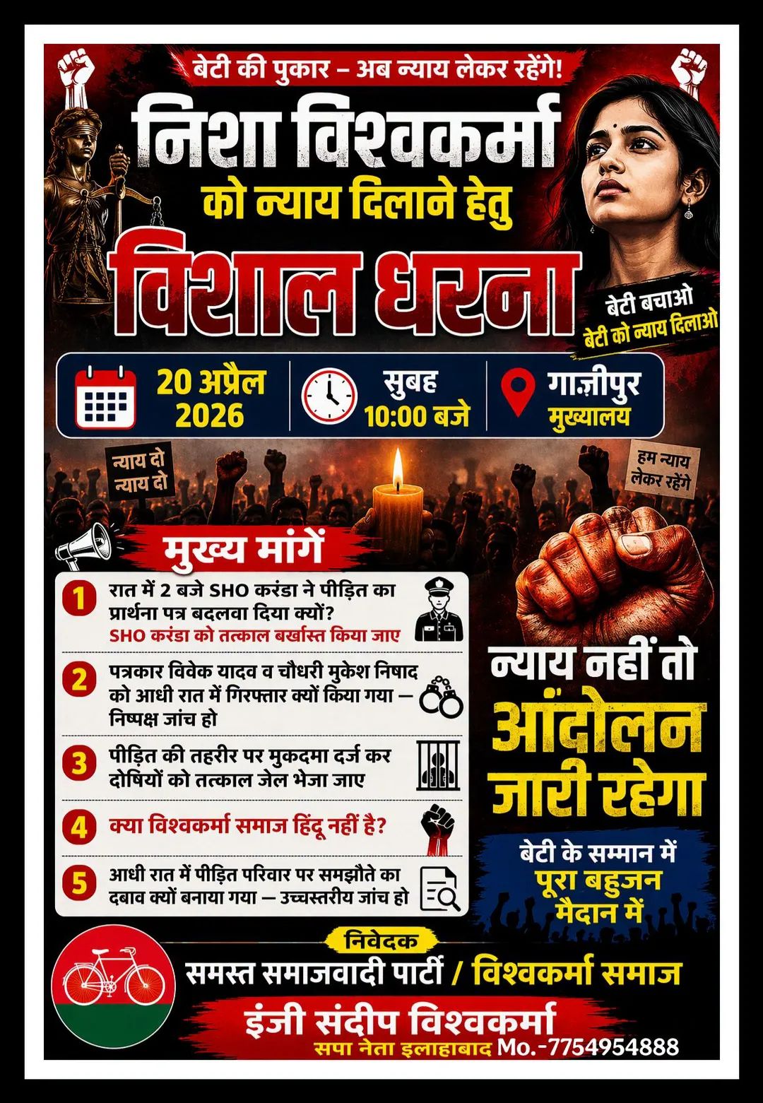 ЁЯЪи рдЧрд╝рд╛рдЬрд╝реАрдкреБрд░ рд╣рддреНрдпрд╛рдХрд╛рдВрдб #рдирд┐рд╢рд╛_рд╡рд┐рд╢реНрд╡рдХрд░реНрдорд╛ рдХреЛ рдиреНрдпрд╛рдп рджрд┐рд▓рд╛рдиреЗ рд╣реЗрддреБ рд╡рд┐рд╢рд╛рд▓ рдзрд░рдирд╛ ЁЯЪи ЁЯУН 20 рдЕрдкреНрд░реИрд▓ 2026 тП░ рд╕реБрдмрд╣ 10:00 рдмрдЬреЗ ЁЯУН рдЧрд╛рдЬреАрдкреБрд░ рдореБрдЦреНрдпрд╛рд▓рдп