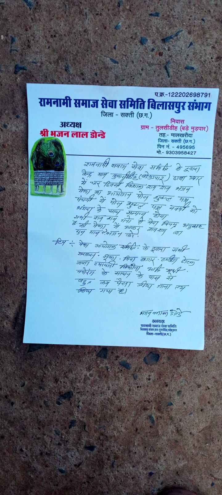 भटगांव/ शक्ति - रामनामी समाज सेवा समिति के द्वारा शक्ति जिले के मालखरौदा तहसील अंतर्गत आने वाले ग्राम तुलसीडीह (बड़ेमुड़पार) ढाबा खार में चार दिवसीय विशाल राम - राम भजन मेले का आयोजन होना तय किया गया है। उक्त जानकारी रामनामी समाज सेवा समिति बिलासपुर संभाग के अध्यक्ष श्री भजन लाल डोंडे द्वारा दिया गया हैं। तथा उन्होंने बताया कि उक्त मेले का आयोजन पौष शुक्ल पंचमी से पौष शुक्ल नवमी को भंडारा के साथ संपन्न होगा व उन्होंने ये भी कहा कि सभी राम राम जन, से अनुरोध किया कि भारी से भारी संख्या में पहुंचकर मेले को संपन्न बनाकर व राम जी के गुणगान करके पुण्य के भागी बने। तथा आयोजक समिति के द्वारा सभी सर्कस, झूला, मिनी बाजार, होटल, टॉकीज, कपड़ा व्यापारी, खिलौना आदि सभी मनोरंग के साधन के पास से बहुत कम पैसा लिया जाना तय किया गया है।