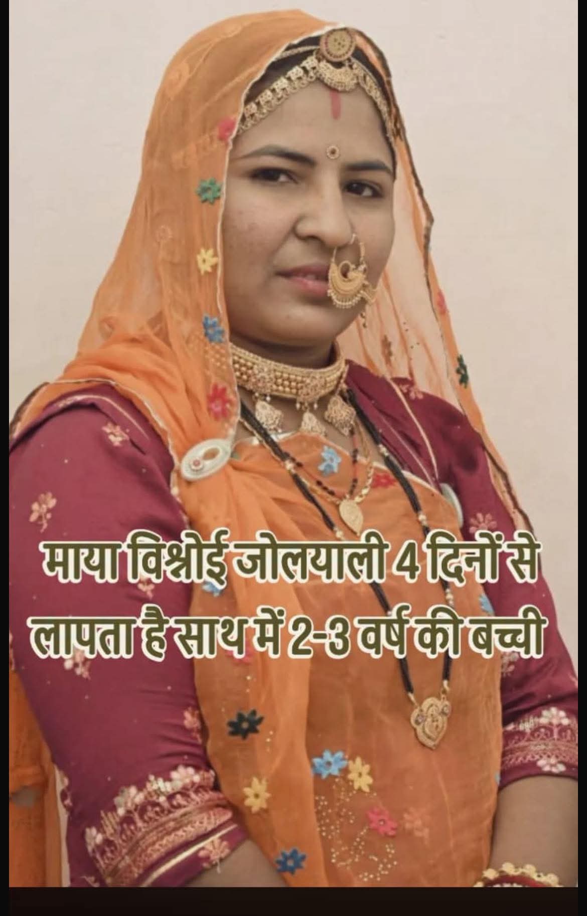 इस महिला का नाम माया बिश्नोई जोलियाली है यह पिछले चार दिनों से लापता है साथ में 2-3 वर्ष की बच्ची भी है ससुराल पक्ष ने जोलियाली पीहर से रोहिला बाड़मेर जाने के लिए बस में बैठाया था और माया के पास 20 तोले आभूषण थे सभी से निवेदन है जिस किसी को भी नजर आए तो तुरंत पुलिस को सूचित करें सूचना देने वाले को उचित ईनाम दिया जाएगा धन्यवाद 🙏