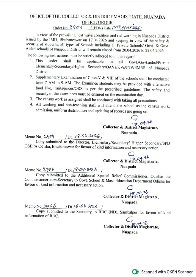 ଅତ୍ୟଧିକ ଗ୍ରୀଷ୍ମ ପ୍ରବାହ ହେତୁ ଆସନ୍ତା 20, 21 ଓ 22 ତାରିଖ ଜିଲ୍ଲା ପ୍ରଶାସନ ଛୁଟି ଘୋଷଣା କରିଛନ୍ତି ।ଅତଏବ ଆସନ୍ତା ତିନି ଦିନ ବିଦ୍ୟାଳୟ ଛୁଟି ରହିବ ।