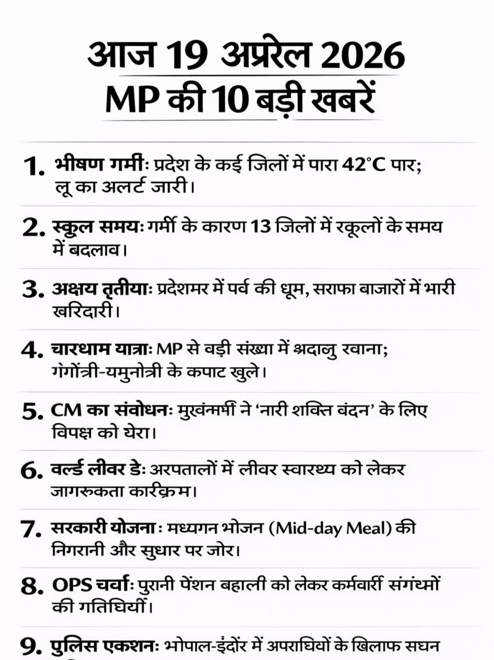आज 19 अप्रैल 2026 MP की 10 बड़ी खबरें - देखें आज की 10 बड़ी खबरें