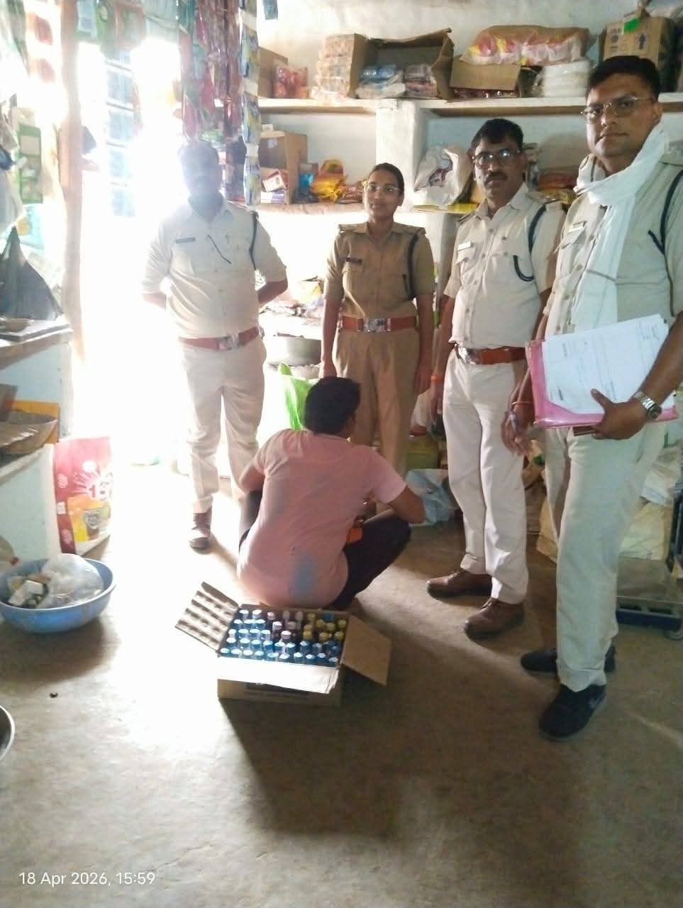 कार्रवाई के दौरान 105 पाव प्लेन मदिरा, 52 पाव मसाला मदिरा, 18 पाव गोवा व्हिस्की तथा 19 केन बीयर बरामद कर जब्त की गई। जब्त मदिरा की कुल कीमत लगभग 18 हजार 540 रुपए आंकी गई है।