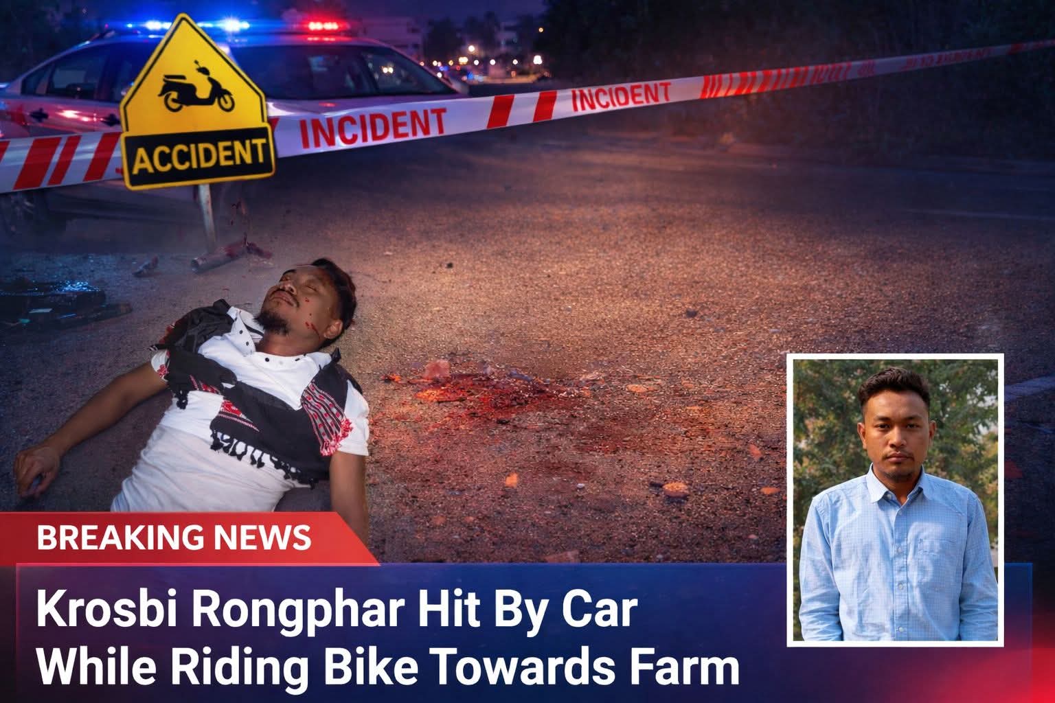​क्रोस्बी अपनी बाइक (AS 03X0384) से अपने खेत की ओर जा रहे थे, तभी एक कार ने उन्हें जोरदार टक्कर मार दी।