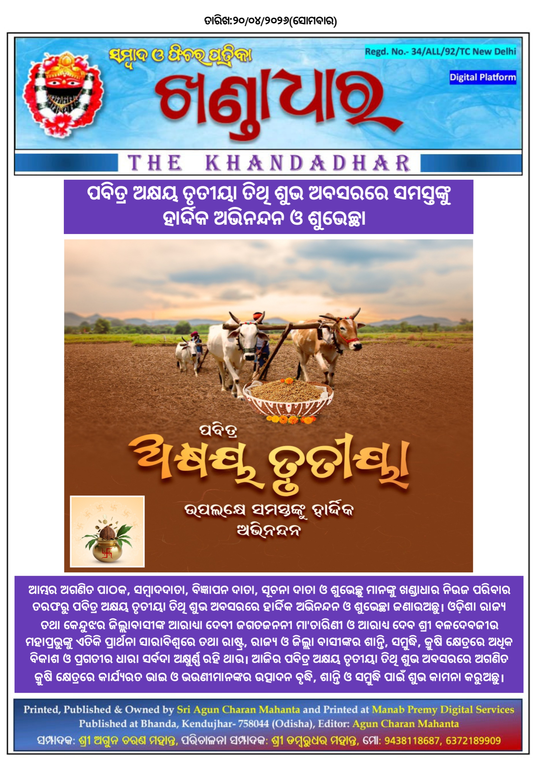 ଆମ୍ଭର ଅଗଣିତ ପାଠକ, ସମ୍ବାଦଦାତା, ବିଜ୍ଞାପନ ଦାତା, ସୂଚନା ଦାତା ଓ ଶୁଭେଚ୍ଛୁ ମାନଙ୍କୁ ଖଣ୍ଡାଧାର ନିଉଜ ପରିବାର ତରଫରୁ ପବିତ୍ର ଅକ୍ଷୟତୃତୀୟା ତିଥି ଶୁଭ ଅବସରରେ ହାର୍ଦ୍ଦିକ ଅଭିନନ୍ଦନ ଓ ଶୁଭେଚ୍ଛା ଜଣାଉଅଛୁ। ଓଡ଼ିଶା ରାଜ୍ୟ ତଥା କେନ୍ଦୁଝର ଜିଲ୍ଲାବାସୀଙ୍କ ଆରାଧ୍ୟା ଦେବୀ ଜଗତଜନନୀ ମା'ତାରିଣୀ ଓ ଆରାଧ୍ୟ ଦେବ ଶ୍ରୀ ବଳଦେବଜୀଉ ମହାପ୍ରଭୁଙ୍କୁ ଏତିକି ପ୍ରାର୍ଥନା ସାରାବିଶ୍ୱରେ ତଥା ରାଷ୍ଟ୍ର, ରାଜ୍ୟ ଓ ଜିଲ୍ଲା ବାସୀଙ୍କର ଶାନ୍ତି, ସମ୍ରୁଦ୍ଧି, କ୍ରୁଷି କ୍ଷେତ୍ରରେ ଅଧିକ ବିକାଶ ଓ ପ୍ରଗତୀର ଧାରା ସର୍ବଦା ଅକ୍ଷୁର୍ଣ୍ଣ ରହି ଥାଉ। ଆଜିର ପବିତ୍ର ଅକ୍ଷୟତୃତୀୟା ତିଥି ଶୁଭ ଅବସରରେ ଅଗଣିତ କ୍ରୁଷି କ୍ଷେତ୍ରରେ କାର୍ଯ୍ୟରତ ଭାଇ ଓ ଭଉଣୀମାନଙ୍କର ଉତ୍ପାଦନ ବୃଦ୍ଧି ପାଇଁ ଶୁଭ କାମନା କରୁଅଛୁ।