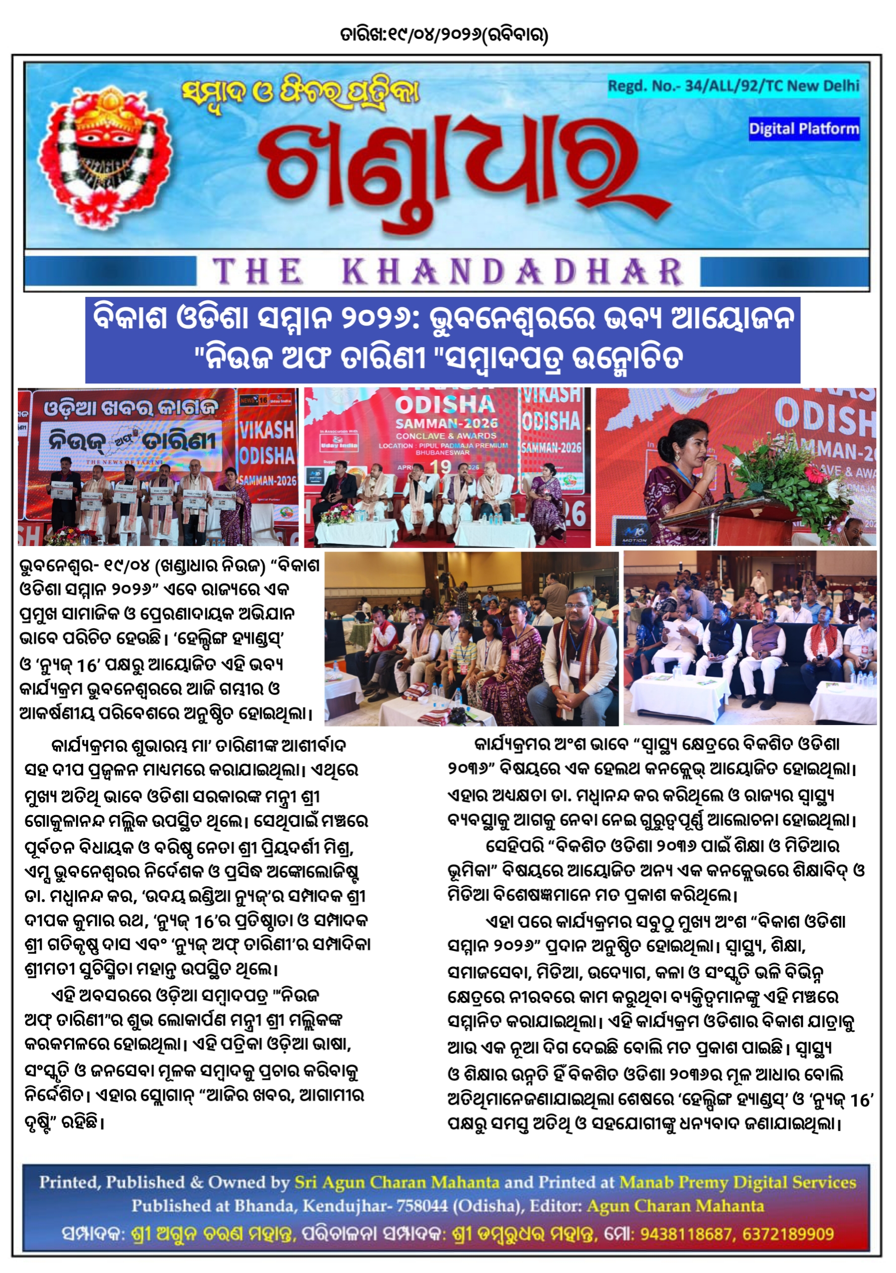 ବିକାଶ ଓଡିଶା ସମ୍ମାନ ୨୦୨୬: ଭୁବନେଶ୍ୱରରେ ଭବ୍ୟ ଆୟୋଜନ, "ନିଉଜ ଅଫ ତାରିଣୀ "ସମ୍ବାଦପତ୍ର ଉନ୍ମୋଚିତ