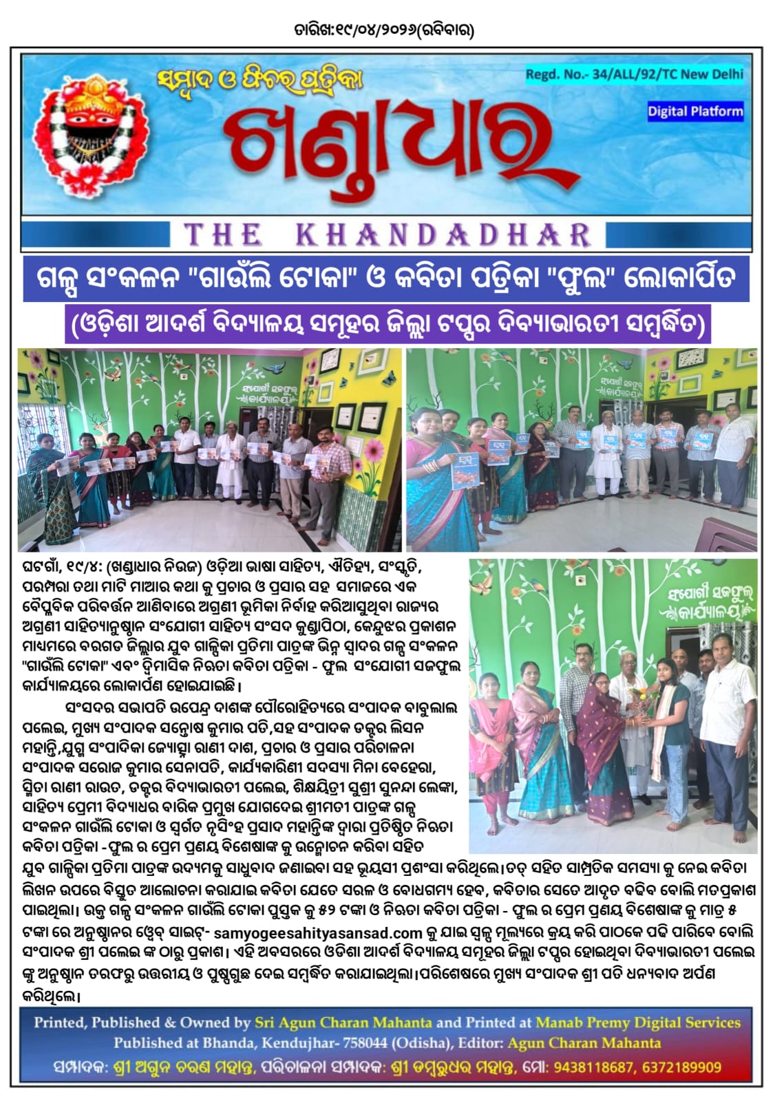 ଘଟଗାଁ ୧୯/୪ : ଓଡ଼ିଆ ଭାଷା ସାହିତ୍ୟ, ଐତିହ୍ୟ, ସଂସ୍କୃତି,ପରମ୍ପରା ତଥା ମାଟି ମାଆର କଥା କୁ ପ୍ରଚାର ଓ ପ୍ରସାର ସହ ସମାଜରେ ଏକ ବୈପ୍ଳବିକ ପରିବର୍ତ୍ତନ ଆଣିବାରେ ଅଗ୍ରଣୀ ଭୂମିକା ନିର୍ବାହ କରିଆସୁଥିବା ରାଜ୍ୟର ଅଗ୍ରଣୀ ସାହିତ୍ଯାନୁଷ୍ଠାନ ସଂଯୋଗୀ ସାହିତ୍ୟ ସଂସଦ କୁଣ୍ଡାପିଠା, କେନ୍ଦୁଝର ପ୍ରକାଶନ ମାଧ୍ୟମରେ ବରଗଡ ଜିଲ୍ଲାର ଯୁବ ଗାଳ୍ପିକା ପ୍ରତିମା ପାତ୍ରଙ୍କ ଭିନ୍ନ ସ୍ୱାଦର ଗଳ୍ପ ସଂକଳନ " ଗାଉଁଲି ଟୋକା " ଏବଂ ଦ୍ବିମାସିକ ନିଋତା କବିତା ପତ୍ରିକା -ଫୁଲ ସଂଯୋଗୀ ସଜଫୁଲ କାର୍ଯ୍ୟାଳୟରେ ଲୋକାର୍ପଣ ହୋଇଯାଇଛି।