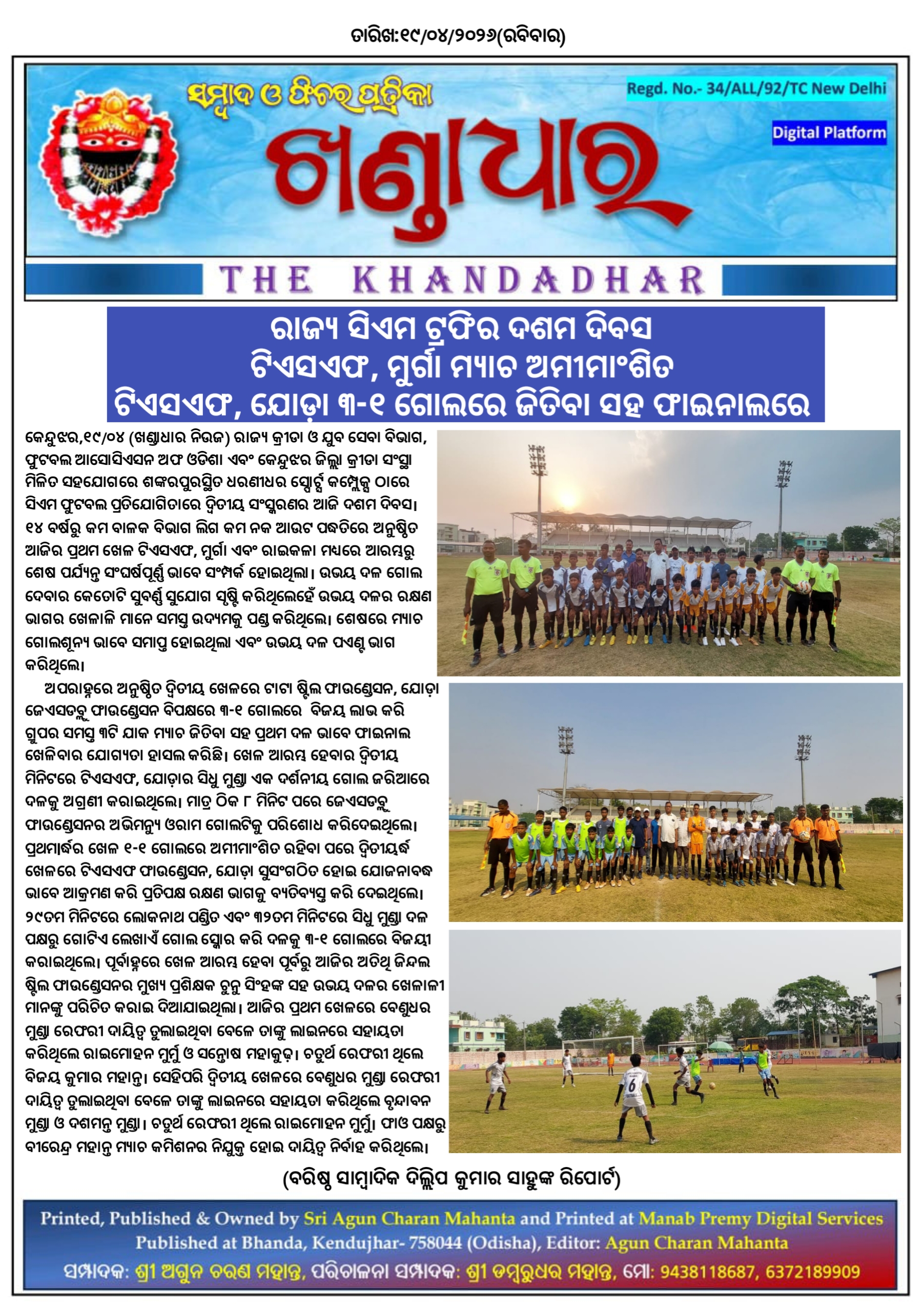 ରାଜ୍ୟ ସିଏମ ଟ୍ରଫିର ଦଶମ ଦିବସ ଟିଏସଏଫ, ମୁର୍ଗା ମ୍ୟାଚ ଅମୀମାଂଶିତ ଟିଏସଏଫ, ଯୋଡ଼ା ୩-୧ ଗୋଲରେ ଜିତିବା ସହ ଫାଇନାଲରେ