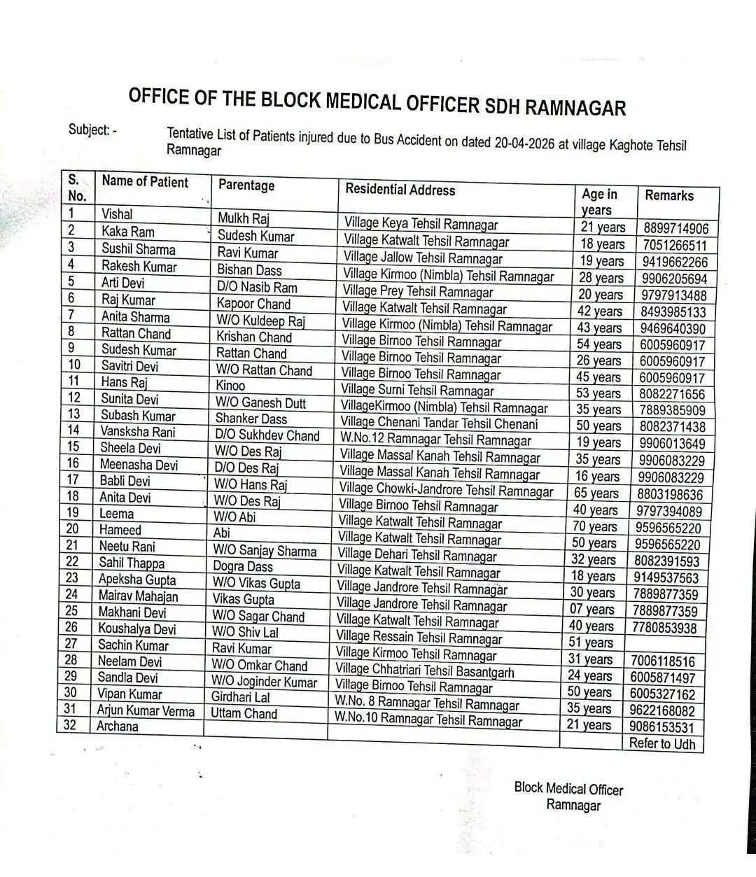 : Tentative List of Injured Patients: Bus Accident at Village Kaghote, Ramnagar.