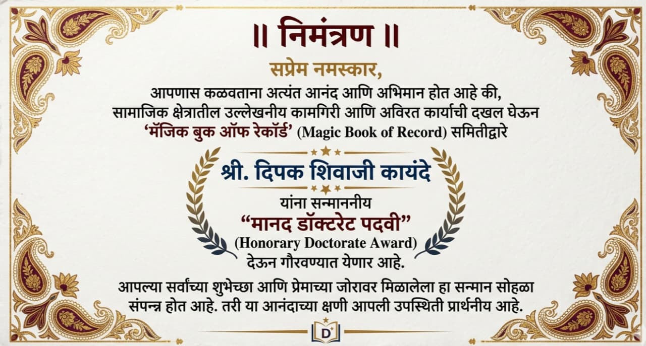 दिपक शिवाजी कायंदे यांना 'मॅजिक बुक ऑफ रेकॉर्ड' तर्फे मानद डॉक्टरेट पदवी जाहीर