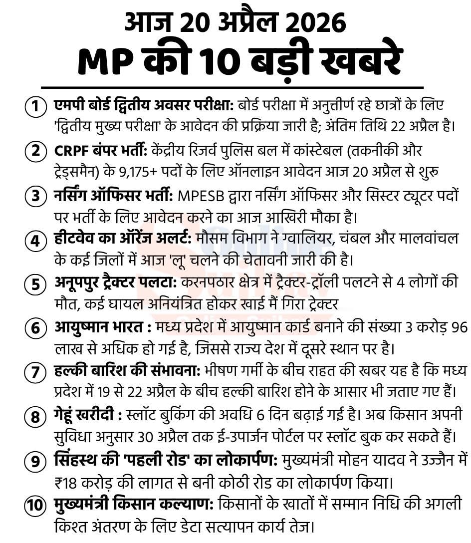 आज 20 अप्रैल 2026 MP की 10 बड़ी खबरे | मध्यप्रदेश आज की खबरे एक नजर मैं देखें | एमपी बोर्ड द्वितीय अवसरपरीक्षा अंतिम तिथि 22 अप्रैल।