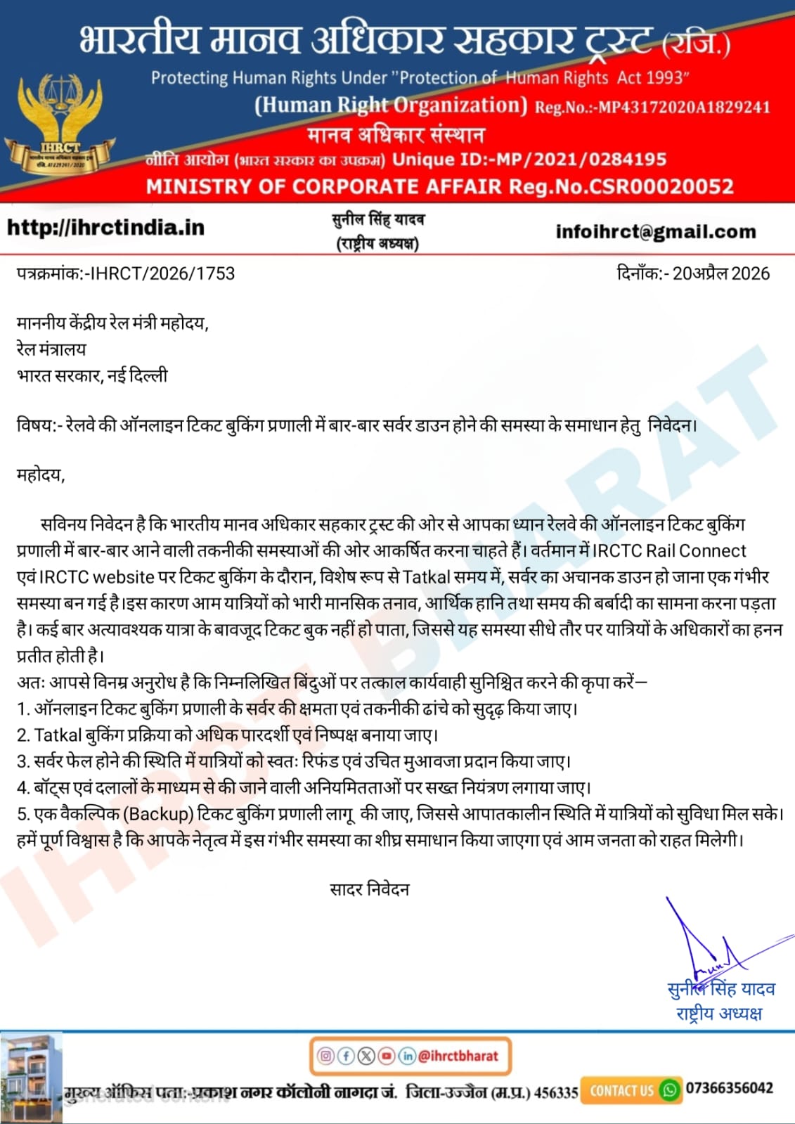भारतीय मानव अधिकार सहकार ट्रस्ट (IHRCT) ने रेल्वे की ऑनलाइन टिकट बुकिंग प्रणाली में लगातार आ रही तकनीकी समस्याओं को लेकर कड़ा विरोध दर्ज कराया है। संगठन ने बताया कि IRCTC Rail Connect एवं IRCTC website पर टिकट बुकिंग के दौरान, विशेषकर Tatkal समय में, सर्वर का अचानक डाउन हो जाना आम यात्रियों के लिए बड़ी परेशानी बन गया है।
