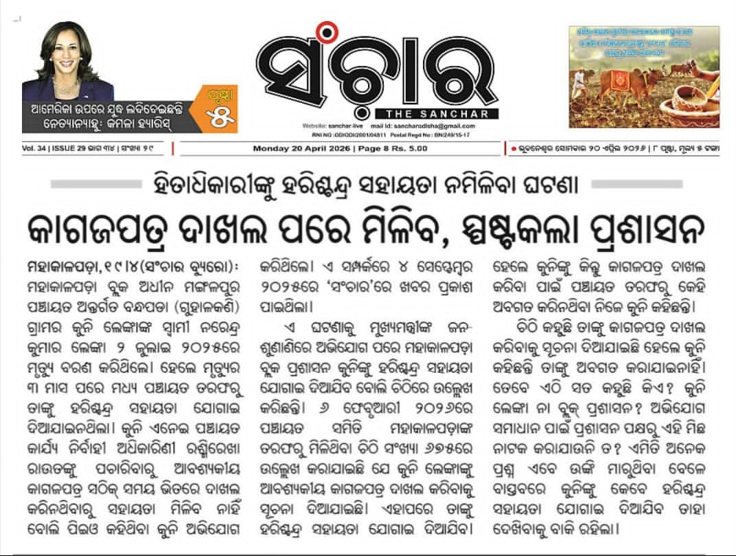 ମହାକାଳପଡ଼ା ରେ ହରହରିଶ୍ଚନ୍ଦ୍ର ଯୋଜନା କେତେକ ଲୋକଙ୍କୁ ନ ମିଳିବା ତଥ୍ୟ ପବ୍ଲିକ୍ ସାମ୍ନାକୁ ଆସିଛି।ଏଥିରେ କେତେକ ଲୋକଙ୍କୁ ନ ମିଳିବା ଅଭିଯୋଗ ହୋଇଥିଲା । କାର୍ଯ୍ୟନିର୍ବାହୀ ଅଧିକାରୀ ସ୍ପଷ୍ଟ କରିଛନ୍ତି ଯେ କାଗଜ ପତ୍ର ଦାଖଲ ପ୍ରକ୍ରିୟା ପରେ ହିଁ ହରିଶ୍ଚନ୍ଦ୍ର ଯୋଜନା ମିଳିବା ନେଇ ସ୍ପଷ୍ଟ କରିଛନ୍ତି।