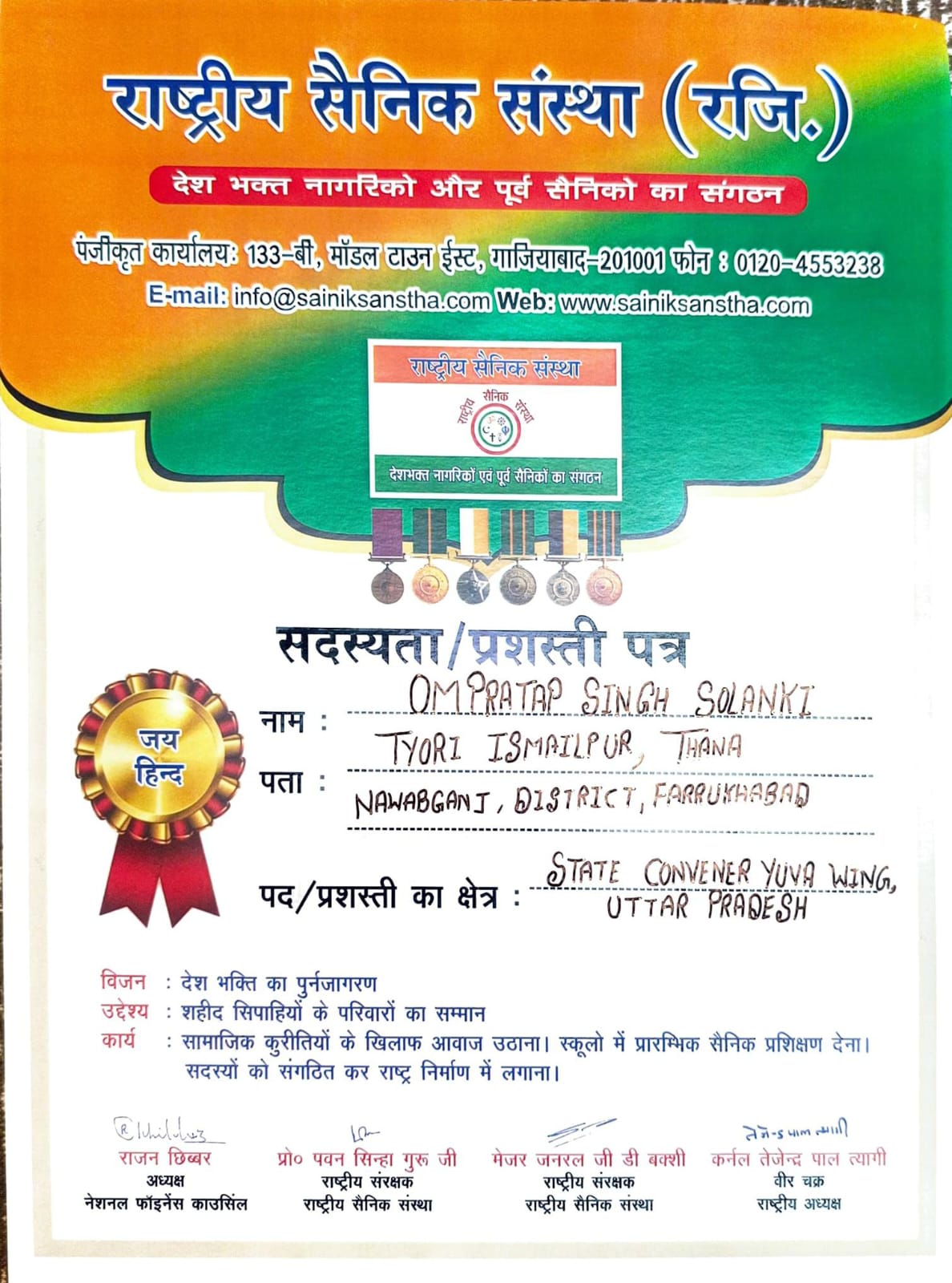 राष्ट्रीय सैनिक संस्था के राष्ट्रीय अध्यक्ष वीर चक्र प्राप्त कर्नल तेजेन्द्र पाल त्यागी जी के आदेश अनुसार