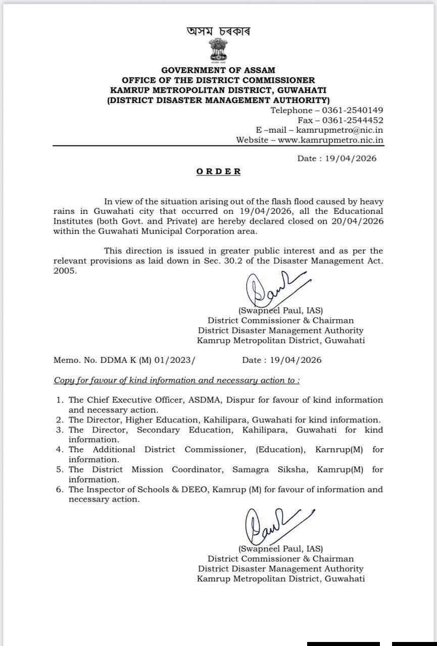 যোৱাকালি বৰষুণৰ বাবে অচল গুৱাহাটী মহানগৰৰ। সকলো চৰকাৰী বেচৰকাৰী শিক্ষানুষ্ঠান সমূহ ২০ এপ্ৰিলত বন্ধ ৰখা হৈছে।