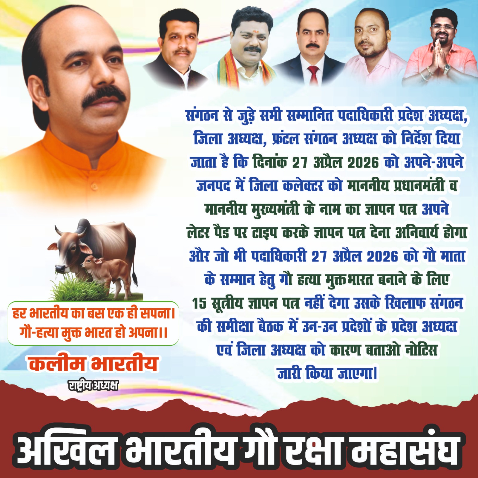 अखिल भारतीय गौ रक्षा महासंघ के राष्ट्रीय अध्यक्ष कलीम भारतीय ने देशभर के पदाधिकारियों को आगामी 27 अप्रैल को लेकर कड़े निर्देश जारी किए हैं। संगठन द्वारा "गौ-हत्या मुक्त भारत" के संकल्प को लेकर पूरे देश के प्रत्येक जनपद में जिला कलेक्टर के माध्यम से माननीय प्रधानमंत्री और मुख्यमंत्री को संबोधित एक 15 सूत्रीय ज्ञापन सौंपा जाएगा।