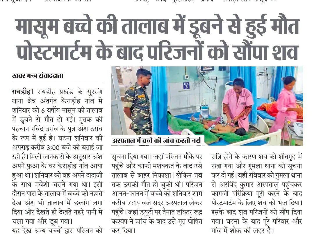 रायडीह (गुमला): रायडीह प्रखंड के सुरसंग थाना क्षेत्र अंतर्गत केराडीह गांव में शनिवार को एक हृदयविदारक घटना घटी, जहां तालाब में डूबने से एक 6 वर्षीय बच्चे की जान चली गई। मृतक की पहचान रवींद्र उरांव के पुत्र अंश उरांव के रूप में हुई है।