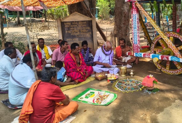 ଏହି କାର୍ଯ୍ୟକ୍ରମରେ ମନ୍ଦିରର ମୁଖ୍ୟ ପୂଜକ ବିଜୟାନନ୍ଦ ପଣ୍ଡାଙ୍କ ପୌରହିତ୍ୟରେ ମୁଖ୍ୟ କର୍ତ୍ତା ଜେ. ରାଙ୍ଗା ରାଓ, ବିଶ୍ୱ ହିନ୍ଦୁ ପରିଷଦର କ୍ଷେତ୍ରୀୟ ପ୍ରଚାରକ ଅର୍ଜୁନ ଶାସ୍ତ୍ରୀ, ଟ୍ରଷ୍ଟ ସଭାପତି ସନାତନ ମାଢୀ ସହ ଅନ୍ୟାନ୍ୟ ସଦସ୍ୟମାନେ ଉପସ୍ଥିତ ଥିଲେ। ପ୍ରଥମେ ମନ୍ଦିର ସମୀପର ଜମିରେ ଅଖିମୁଠି ଅନୁକୂଳ କରାଯାଇଥିଲା, ପରେ ରଥକୁ ପୂଜାର୍ଚ୍ଚନା କରାଯାଇ ରଥକାଠ ଅନୁକୂଳ ହୋଇଥିଲା।