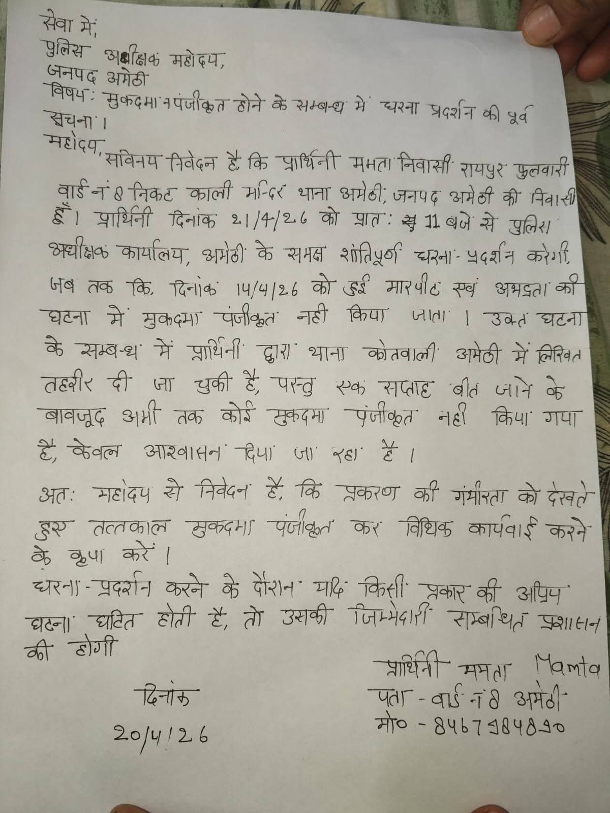 पीड़ित पक्ष ने चेतावनी दी है कि यदि शीघ्र मुकदमा दर्ज कर आवश्यक कानूनी कार्रवाई नहीं की गई, तो दिनांक 21 अप्रैल 2026 को पुलिस अधीक्षक कार्यालय, अमेठी के समक्ष शांतिपूर्ण धरना प्रदर्शन किया जाएगा।