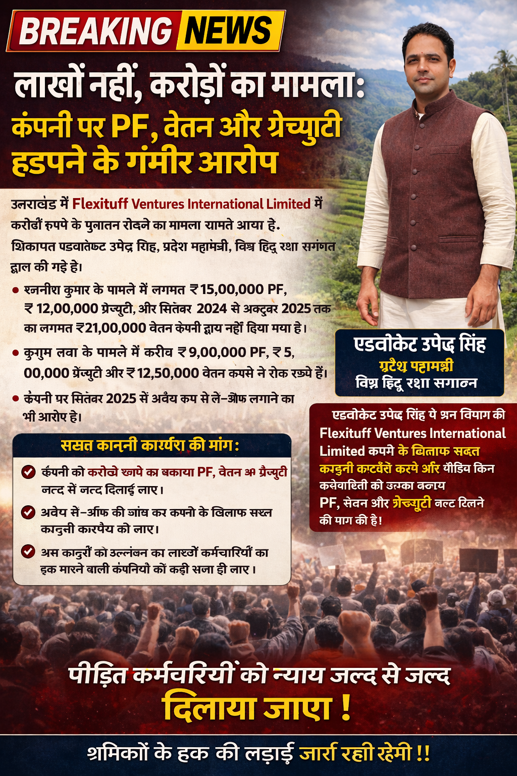 उत्तराखंड में श्रमिक शोषण का एक बेहद गंभीर और बड़ा मामला सामने आया है, जहां Flexituff Ventures International Limited कंपनी के खिलाफ भारी वित्तीय अनियमितताओं के आरोप लगे हैं। यह शिकायत एडवोकेट उपेंद्र सिंह, प्रदेश महामंत्री, विश्व हिंदू रक्षा संगठन द्वारा श्रम विभाग, उत्तराखंड में दर्ज कराई गई है।