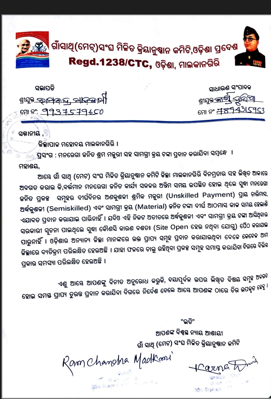 ମାଲକାନଗିରି ଜିଲ୍ଲାରେ ମନରେଗା କାର୍ଯ୍ୟରେ ଶ୍ରମିକ ମଜୁରୀ ଓ ସାମଗ୍ରୀ କ୍ରୟ ଟଙ୍କା ଦୀର୍ଘଦିନ ଧରି ବକେୟା ରହିଥିବା ନେଇ ଗାଁସାଥ୍ (ମେଟ୍) ସଂଘ ମିଳିତ କ୍ରିୟାନୁଷ୍ଠାନ କମିଟି, ଓଡ଼ିଶା ପ୍ରଦେଶ, ମାଲକାନଗିରି ପକ୍ଷରୁ ଜିଲ୍ଲାପାଳଙ୍କୁ ଏକ ଦାବିପତ୍ର ପ୍ରଦାନ କରାଯାଇଛି।
