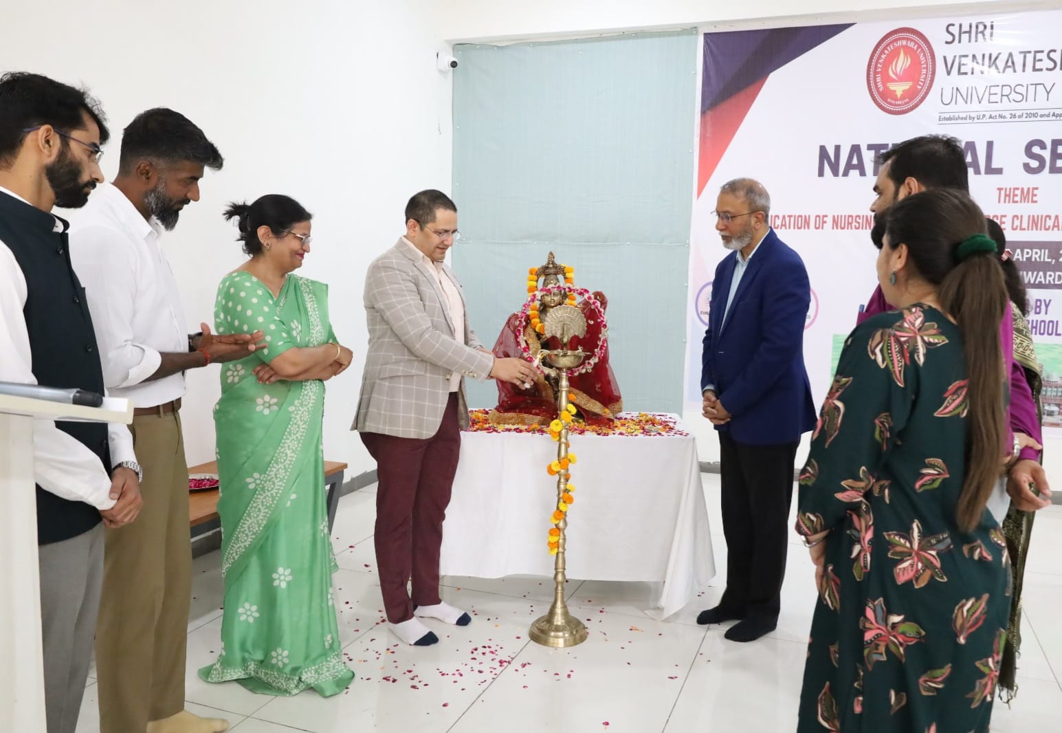श्री वेंक्टेश्वरा विश्वविद्यालय के स्कूल आॅफ नर्सिंग की ओर से ’’नर्सिंग क्षेत्र में आदर्श नैदानिक वातावरण की स्थापना में चुनौतियाँ एवं समाधान’’ विषय पर आयोजित एकदिवसीय राष्ट्रीय सेमीनार का शुभारम्भ प्रतिकुलाधिपति डाॅ0 राजीव त्यागी, कुलपति प्रो0 कृष्ण कान्त दवे, उ0प्र0 यूनिवर्सिटी ऑफ़ मेडिकल साईंसेस के प्रो0 सैम्बियन एन0, आर0एम0एल0 हाॅस्पीटल नयी दिल्ली की प्रो0 साक्षी गौतम, प्रो0 प्रमोद कुमार, गुरू तेग बहादुर हाॅस्पीटल दिल्ली के सीनियर नर्सिंग ऑफिसर पवन कुमार, डीन नर्सिंग डाॅ0 ऐना ऐरिक ब्राउन, डाॅ0 मंजरी राणा आदि ने सरस्वती माँ की प्रतिमा के सन्मुख दीप प्रज्जवलित करके किया।