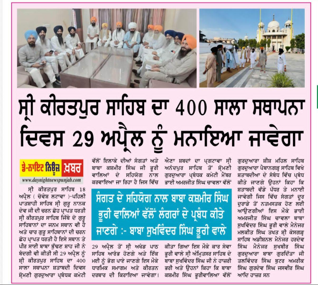 ਸ੍ਰੀ ਕੀਰਤਪੁਰ ਸਾਹਿਬ ਦਾ 400 ਸਾਲਾ ਸਥਾਪਨਾ ਦਿਵਸ 29 ਅਪ੍ਰੈਲ ਨੂੰ ਮਨਾਇਆ ਜਾਵੇਗਾ