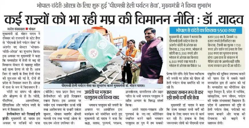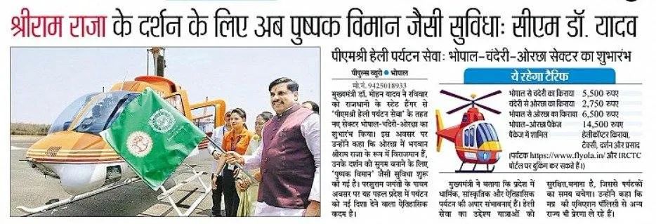 मुख्यमंत्री डॉ. मोहन यादव ने "पीएमश्री हेली पर्यटन सेवा" के अंतर्गत नए सेक्टर भोपाल -चंदेरी -ओरछा हेलीकॉप्टर यात्रा का किया शुभारंभ