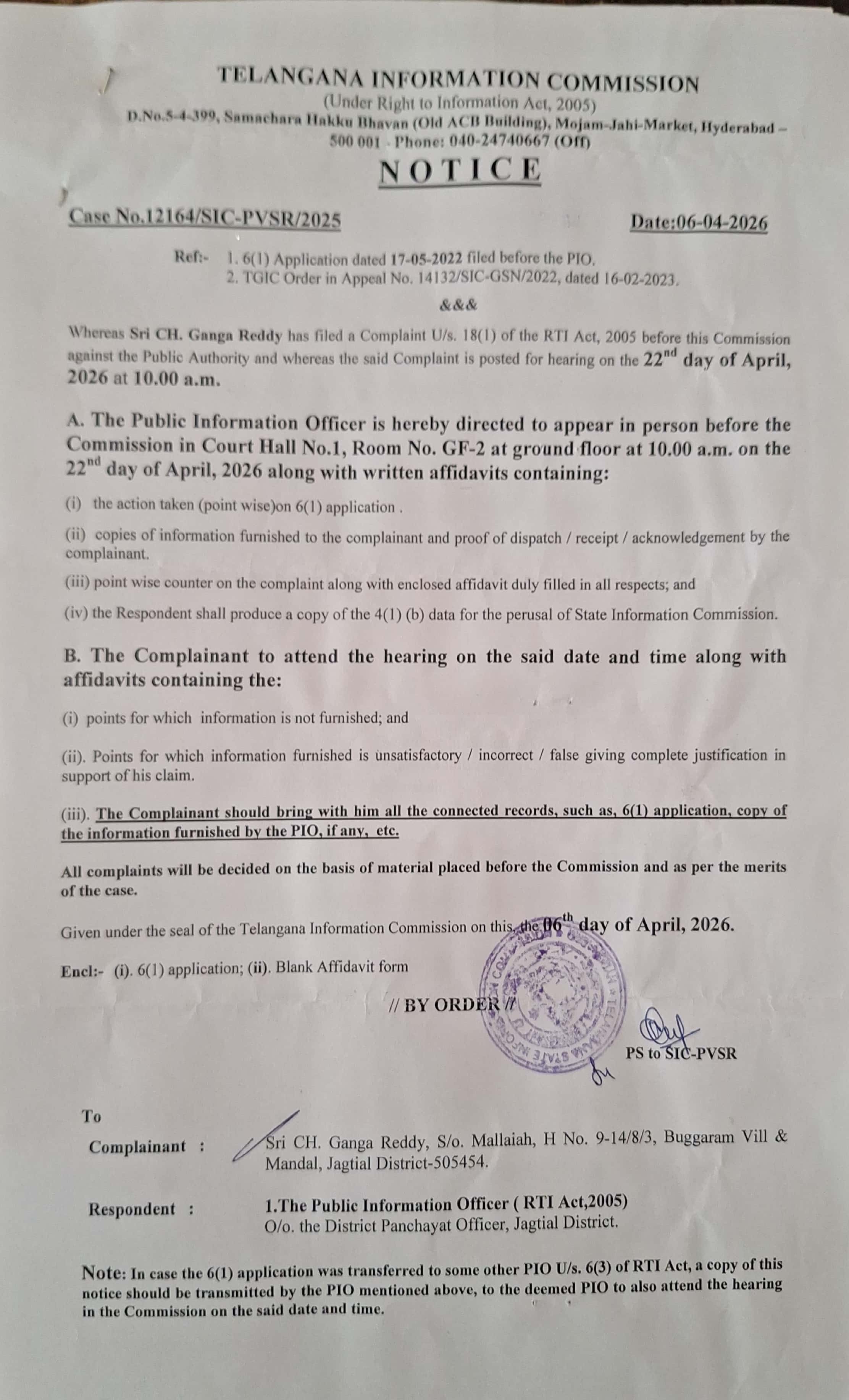 జగిత్యాల జిల్లా పంచాయతీ అధికారి కార్యాలయంలోని ప్రజా సమాచార అధికారికి తెలంగాణ రాష్ట్ర సమాచార కమిషన్ నుండి నోటీసులు జారీ అయ్యాయి. ప్రముఖ సామాజిక కార్యకర్త, సీనియర్ ఆర్టీఐ కార్యకర్త చుక్క గంగారెడ్డి