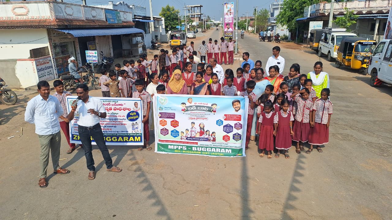 ప్రభుత్వ పాఠశాలల్లో మీ పిల్లలను చేర్పించండి, వారి ఉజ్వల భవిష్యత్ ను తీర్చిదిద్దుతాం అంటూ బుగ్గారం మండల కేంద్రంలో సోమవారం బడిబాట కార్యక్రమం నిర్వహించారు. జిల్లా పరిషత్ ఉన్నత పాఠశాల, ప్రాథమిక పాఠశాల, పూర్వ ప్రాథమిక పాఠశాలల విద్యార్థిని - విద్యార్థులతో ఉపాధ్యాయినీ - ఉపాధ్యాయులు, అంగన్ వాడి టీచర్ లు గల్లీ - గల్లీ కి వెళ్లి ర్యాలీ నిర్వహించారు. ప్రధాన కూడళ్లలో ప్రధానోపాధ్యాయులు అన్నాడి మోహన్ రెడ్డి మాట్లాడుతూ ప్రభుత్వ పాఠశాలల్లో ఉన్న వసతులు, శిక్షణా నైపుణ్యం తో అనుభవం గల బోధనా టీచర్ల గూర్చి వివరించారు. బుగ్గారం సర్పంచ్ నక్క రాజవ్వ, స్కూల్ మేనేజ్మెంట్ కమిటి ప్రతినిధులు, పూర్వ విద్యార్థి, సామాజిక కార్యకర్త, విడిసి వ్యవస్థాపక అధ్యక్షులు చుక్క గంగారెడ్డి తదితరులు పాల్గొన్నారు.