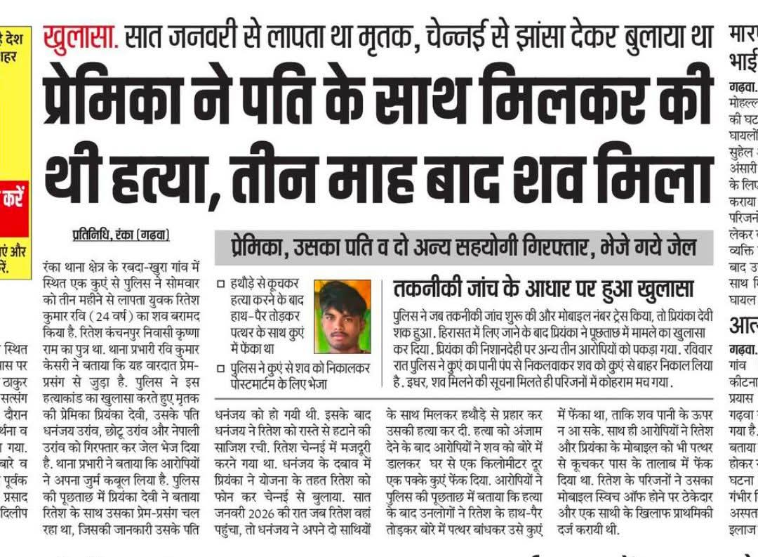 रंका (गढ़वा): रंका थाना क्षेत्र के रपदा-खुरा गांव में पिछले तीन महीनों से लापता एक युवक की हत्या का सनसनीखेज खुलासा हुआ है। पुलिस ने सोमवार को एक कुएं से 24 वर्षीय रितेश कुमार रवि का शव बरामद किया। इस मामले में पुलिस ने मृतक की प्रेमिका, उसके पति और दो अन्य सहयोगियों को गिरफ्तार कर जेल भेज दिया है।