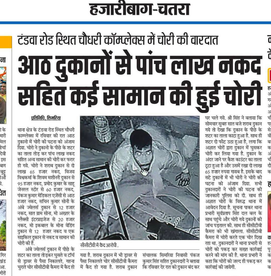 चोरी की बड़ी वारदात: चतरा के सिमरिया में आठ दुकानों के ताले टूटे, 5 लाख नकद समेत लाखों के जेवर पार