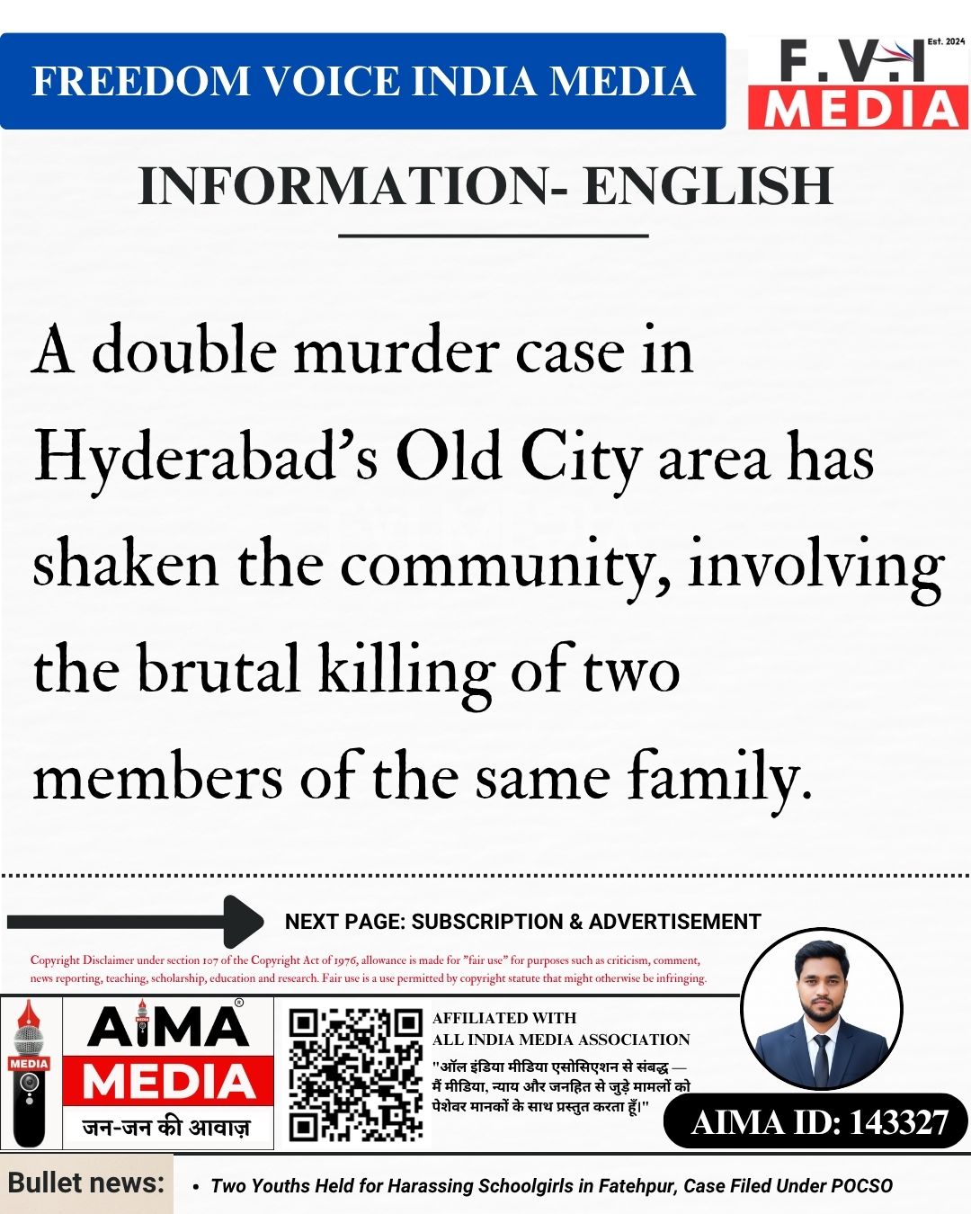 Hyderabad ke Dabeerpura ke Noor Khan Bazar area mein ek shocking double murder ka case saamne aaya hai. Reports ke mutabiq Ajmeri Begum aur unke husband Aqeel Khan ko unke hi relative Adil Khan ne allegedly murder kar diya.