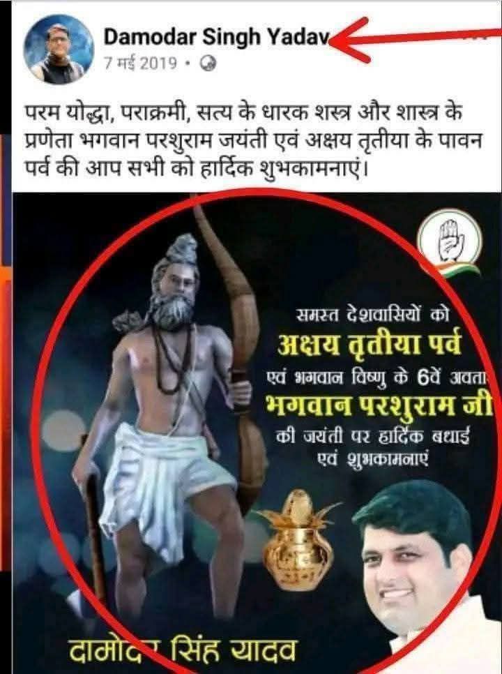 2019 में सोशल मीडिया पर भगवान परशुराम जयंती की शुभकामनाएं देने वाले दामोदर सिंह यादव आज वही परशुराम जी को न पहचानने का दावा कर रहे हैं। यह वही व्यक्ति है जिसने कभी परशुराम को "परम योद्धा और सत्य के धारक" कहकर सम्मानित किया था, लेकिन अब सोशल मीडिया पर ऐसे बयान दे रहा है मानो परशुराम का नाम उसने पहली बार सुना हो।