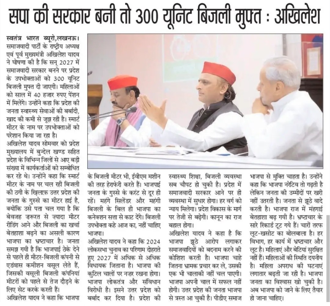 "सपा की सरकार बनी तो 300 यूनिट बिजली मुफ़्त दी जाएगी।" – माननीय राष्ट्रीय अध्यक्ष श्री अखिलेश यादव जी