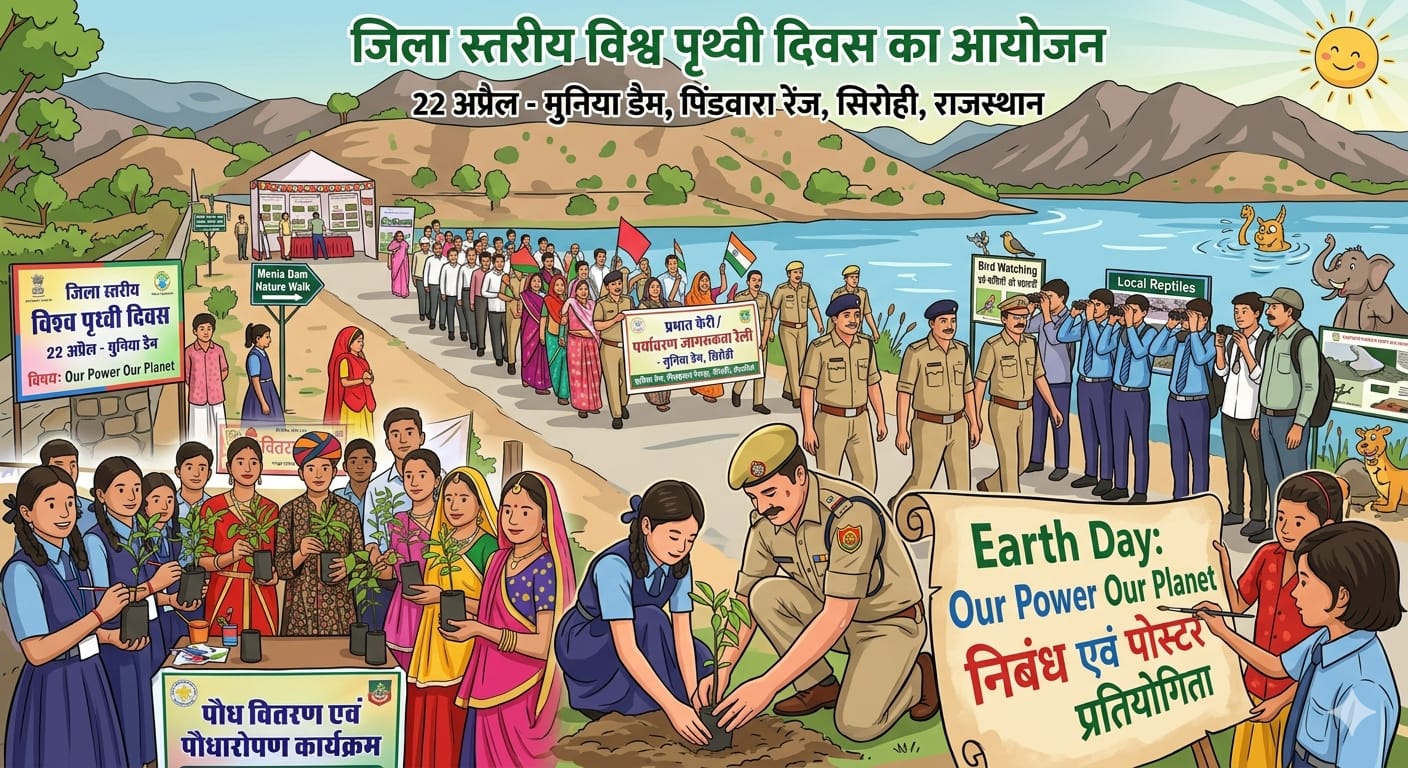 राजस्थान सरकार के पर्यावरण एवं जलवायु परिवर्तन मंत्रालय के निर्देशानुसार, आगामी 22 अप्रैल को पूरे राज्य के साथ सिरोही जिले में भी *'विश्व पृथ्वी दिवस'* उत्साहपूर्वक मनाया जाएगा। इस वर्ष जिले का मुख्य जिला स्तरीय कार्यक्रम सिरोही वन मंडल की *पिण्डवाडा रेंज स्थित मांडवाड़ा खालसा में मुनिया डैम* पर आयोजित करने का निर्णय लिया गया है