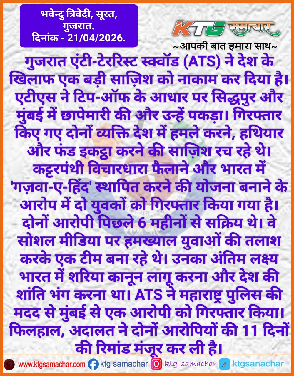 गुजरात ATS ने देश के खिलाफ एक बड़ी साजिश को नाकाम कर दिया है।