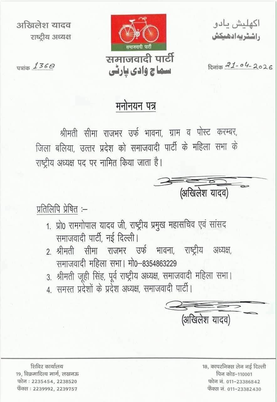 सपा प्रमुख अखिलेश यादव ने यूपी बलिया की सीमा राजभर को समाजवादी पार्टी की महिला सभा का राष्ट्रीय अध्यक्ष बनाया!!
