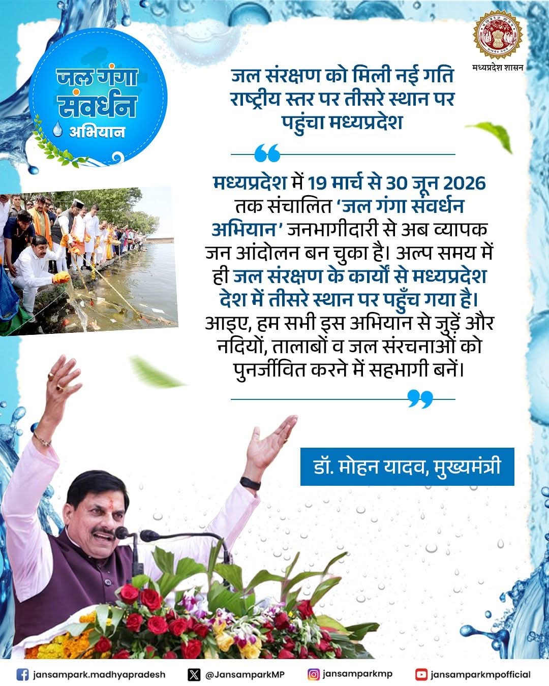 मध्यप्रदेश में 19 मार्च से 30 जून 2026 तक संचालित ‘जल गंगा संवर्धन अभियान’ जनभागीदारी से अब व्यापक जन आंदोलन बन चुका है। अल्प समय में ही जल संरक्षण के कार्यों से मध्यप्रदेश देश में तीसरे स्थान पर पहुँच गया है।