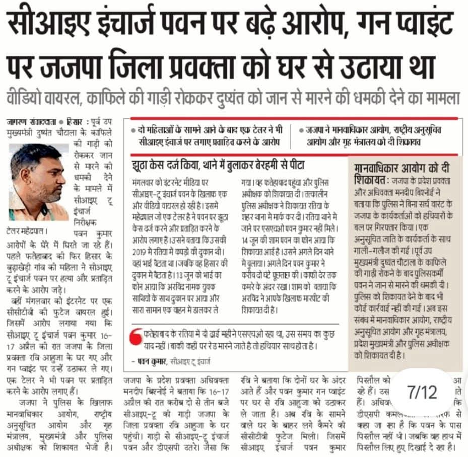 2 हमारी मातृशक्ति व 1 टेलर ने जिस तरीके से CIA पवन के खिलाफ अपने अपने ब्यान दिए और हरियाणा के उप मुख्यमंत्री श्री दुष्यंत चौटाला जी के साथ जिस तरीके का व्यवहार हुवा है तो आम आदमी के साथ तो बहुत ज्यादा होता होगा बाकी 3 सदस्यों ने बया तो कर ही दिए, हरियाणा का गृह विभाग मुख्यमंत्री श्री Nayab Saini जी के पास है और उनकी तरफ से अभी तक कोई भी औपचारिक ब्यान नहीं आया, आखिर क्यों CIA पवन के खिलाफ कार्यवाही करने से सरकार बच रही है