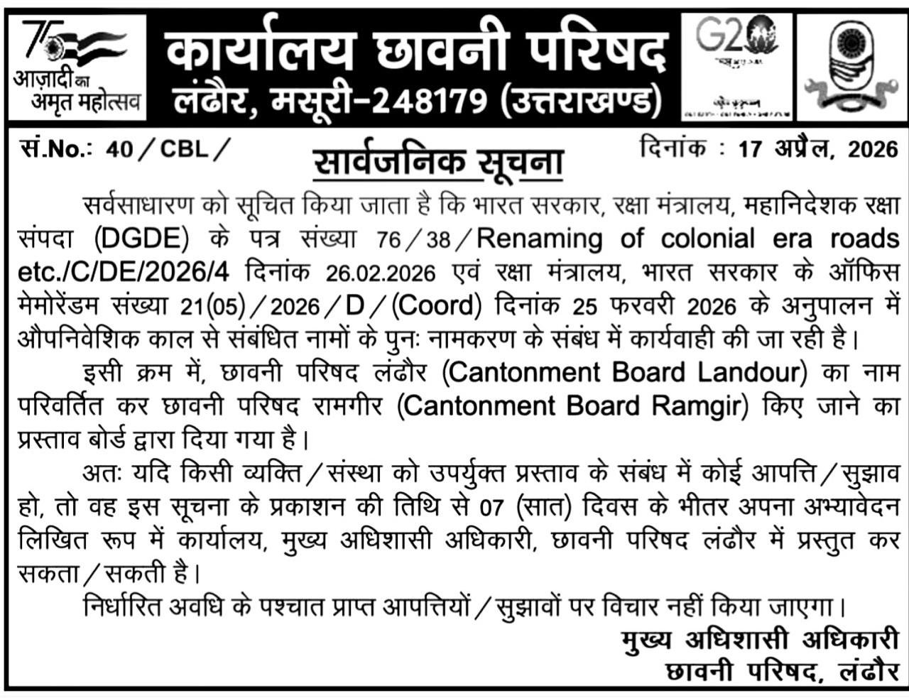 A public notice issued by the Cantonment Board Landour on April 17, 2026—referencing a Ministry of Defence directive on renaming colonial-era roads—has since confirmed that the proposal is official. The Board has invited objections and suggestions within seven days of the notice.