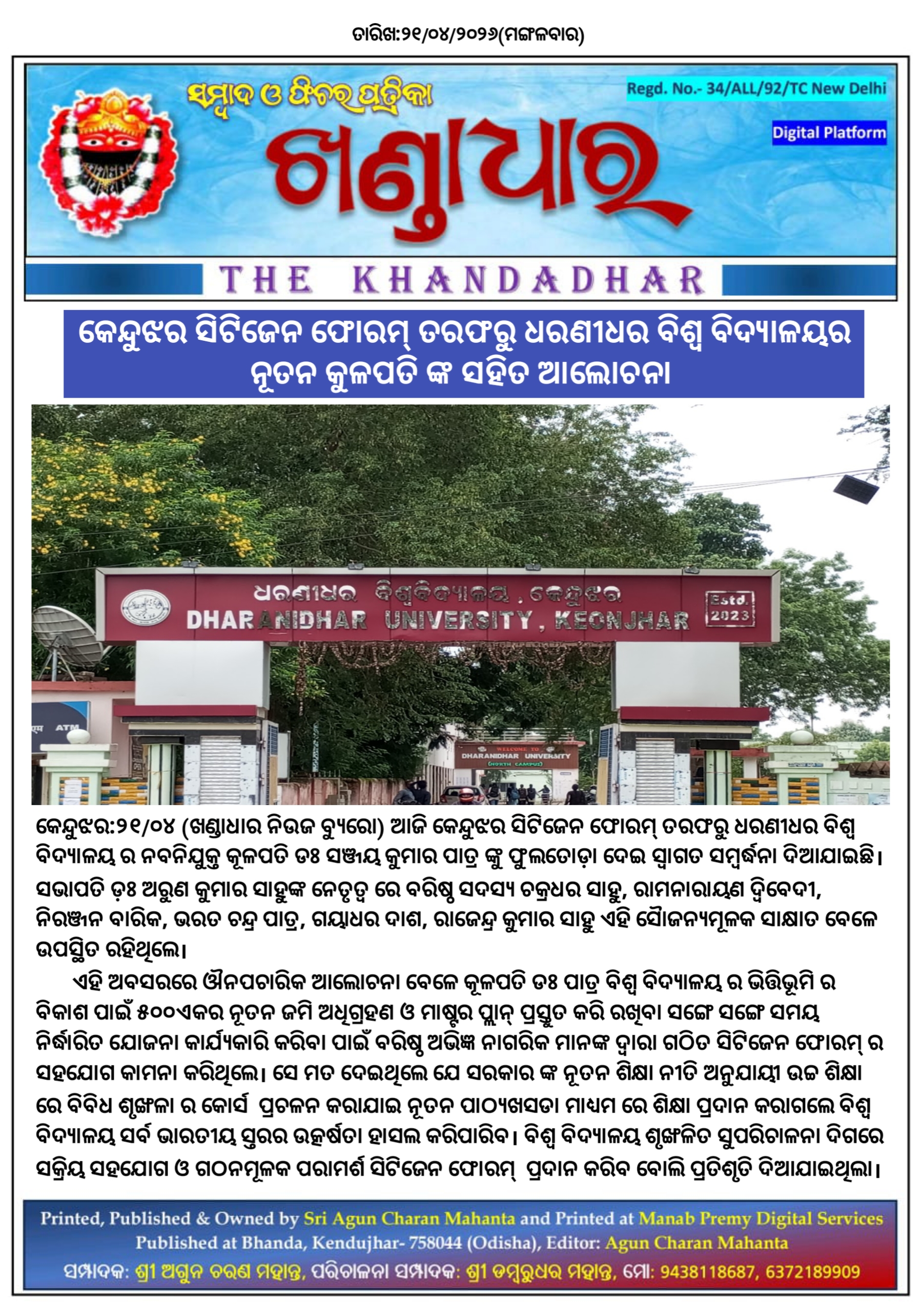 କେନ୍ଦୁଝର ସିଟିଜେନ ଫୋରମ୍ ତରଫରୁ ଧରଣୀଧର ବିଶ୍ୱ ବିଦ୍ୟାଳୟର ନୂତନ କୁଳପତି ଙ୍କ ସହିତ ଆଲୋଚନା।