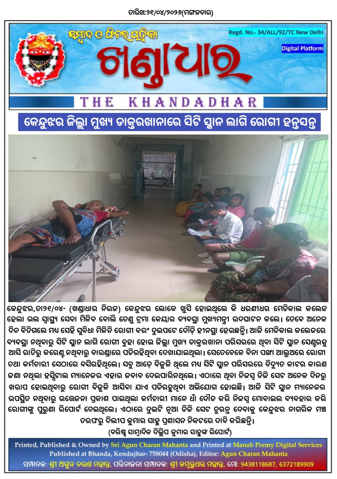 କେନ୍ଦୁଝର,ତା୨୧/୦୪- କେନ୍ଦୁଝର ଲୋକେ ଖୁସି ହୋଇଥିଲେ କି ଧରଣୀଧର ମେଡିକାଲ କଲେଜ ହେଲା ଭଲ ସ୍ୱାସ୍ଥ୍ୟ ସେବା ମିଳିବ ବୋଲି ତେଣୁ ଟ୍ରମା କେୟାର ବ୍ୟବସ୍ଥା ମୁଖ୍ୟମନ୍ତ୍ରୀ ଉଦଘାଟନ କଲେ। ତେବେ ଅନେକ ଦିନ ବିତିଗଲେ ମଧ୍ୟ ସେହି ସୁବିଧା ମିଳିନି ରୋଗୀ ବରଂ ଦୁଇପଟେ ଦୌଡ଼ି ହୀନସ୍ଥା ହେଉଛନ୍ତି। ଆଜି ମେଡିକାଲ କଲେଜରେ ବ୍ୟବସ୍ଥା ନଥିବାରୁ ସିଟି ସ୍କାନ ଲାଗି ରୋଗୀ ବୁହା ହୋଇ ଜିଲ୍ଲା ମୁଖ୍ୟ ଡାକ୍ତରଖାନା ପରିସରରେ ଥିବା ସିଟି ସ୍କାନ ସେଣ୍ଟରକୁ ଆସି ରାତିରୁ କରେଣ୍ଟ ନଥିବାରୁ ବାରଣ୍ଡାରେ ପଡିରହିଥିବା ଦେଖାଯାଇଥିଲା। ସେତେବେଳେ ବିନା ପଙ୍ଖା ଆଲୁଅରେ ରୋଗୀ ତଥା କର୍ମଚାରୀ ସେଠାରେ ବସିରହିଥିଲେ। ସବୁ ଆଡ଼େ ବିଜୁଳି ଥିଲେ ମଧ୍ୟ ସିଟି ସ୍କାନ ପରିସରରେ ବିଦ୍ୟୁତ କାଟର କାରଣ ଜଣା ନଥିଲା ହସ୍ପିଟାଲ ମ୍ୟାନେଜର ଏହାର ଜବାବ ଦେଇପାରିନଥିଲେ। ଏଠାରେ ଥିବା ନିଜସ୍ୱ ଡିଜି ସେଟ ଅନେକ ଦିନରୁ ଖରାପ ହୋଇଥିବାରୁ ରୋଗୀ ବିଜୁଳି ଆସିବା ଯାଏ ପଡିରହୁଥିବା ଅଭିଯୋଗ ହୋଇଛି। ଆଜି ସିଟି ସ୍କାନ ମ୍ୟାନେଜର ଉପସ୍ଥିତ ନଥିବାରୁ ଉତ୍ତେଜନା ପ୍ରକାଶ ପାଇଥିଲା କର୍ମଚାରୀ ମାନେ ଧାଁ ଦୌଡ କରି ନିଜସ୍ୱ ମୋବାଇଲ ବ୍ୟବହାର କରି ରୋଗୀଙ୍କୁ ପୁରୁଣା ରିପୋର୍ଟ ଦେଇଥିଲେ। ଏଠାରେ ଦୁଇଟି ନୂଆ ଡିଜି ସେଟ ତୁରନ୍ତ ଦେବାକୁ କେନ୍ଦୁଝର ନାଗରିକ ମଞ୍ଚ ତରଫରୁ ଦିଲୀପ କୁମାର ସାହୁ ପ୍ରଶାସନ ନିକଟରେ ଦାବି କରିଛନ୍ତି।