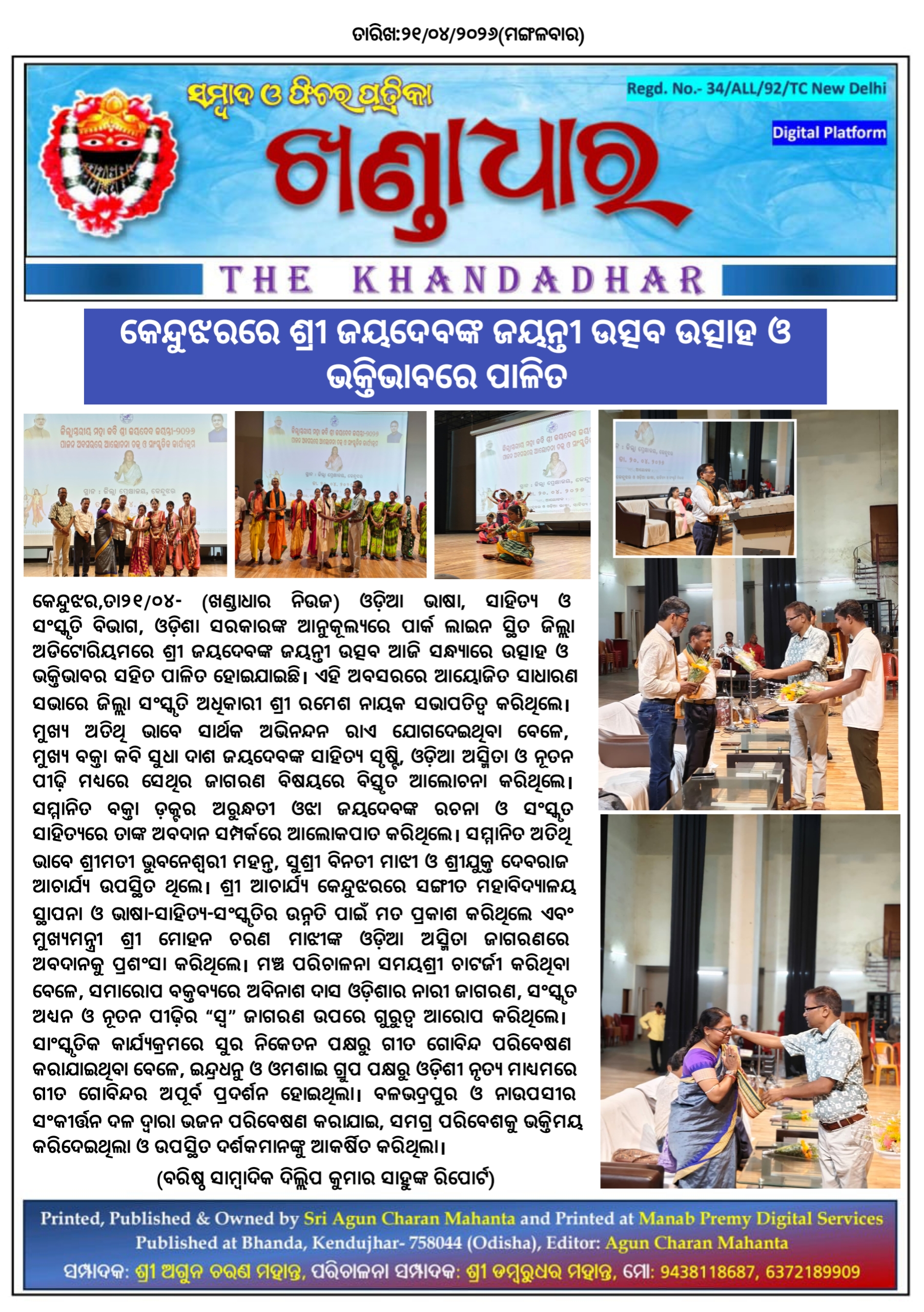 କେନ୍ଦୁଝରରେ ଶ୍ରୀ ଜୟଦେବଙ୍କ ଜୟନ୍ତୀ ଉତ୍ସବ ଉତ୍ସାହ ଓ ଭକ୍ତିଭାବରେ ପାଳିତ।
