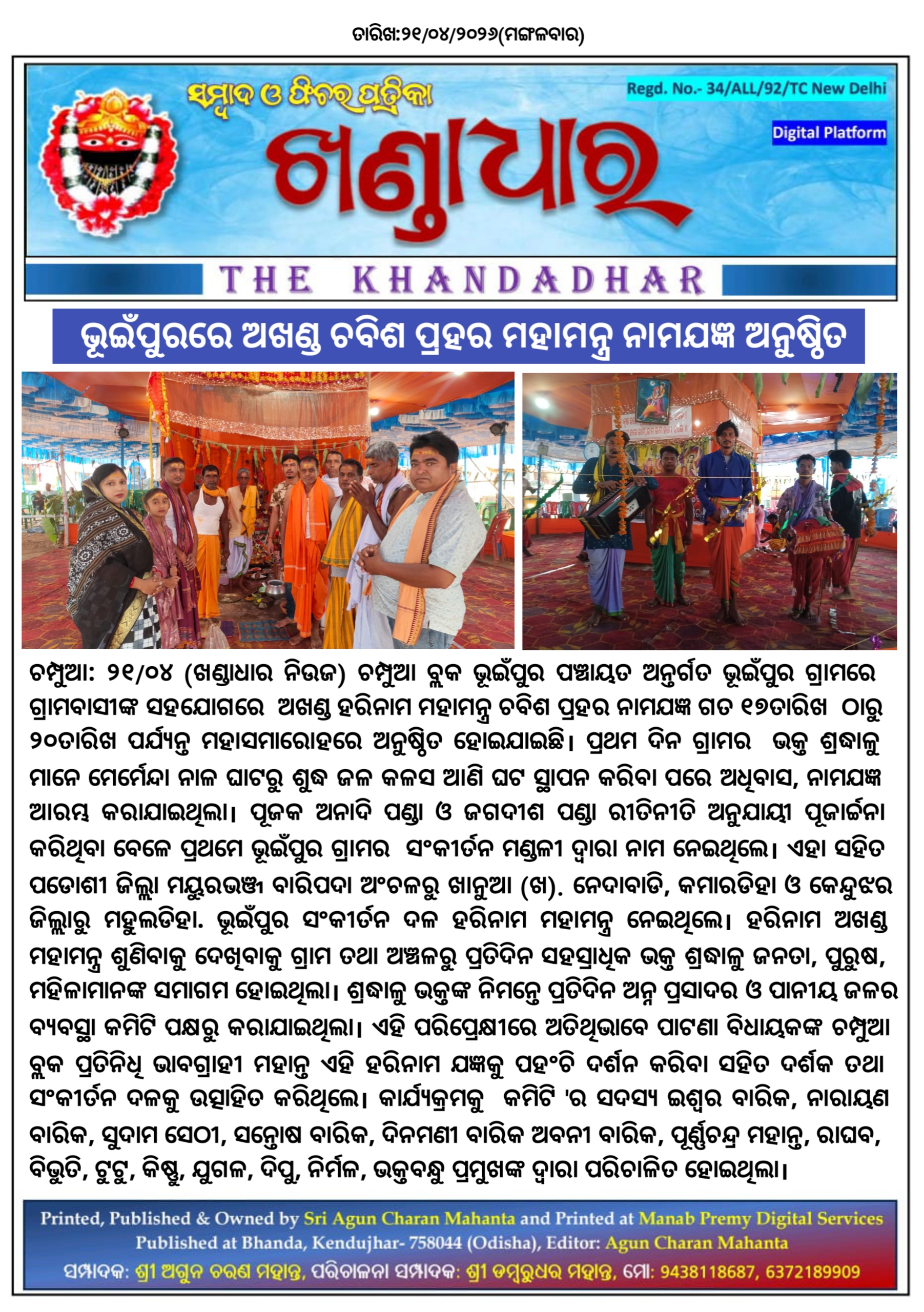 ଚମ୍ପୁଆ -୨୧/୦୪(ଖଣ୍ଡାଧାର ନିଉଜ )ଚମ୍ପୁଆ ବ୍ଲକ ଭୂଇଁପୁର ପଞ୍ଚାୟତ ଅନ୍ତର୍ଗତ ଭୂଇଁପୁର ଗ୍ରାମରେ ଗ୍ରାମବାସୀଙ୍କ ସହଯୋଗରେ ଅଖଣ୍ଡ ହରିନାମ ମହାମନ୍ତ୍ର ଚବିଶ ପ୍ରହର ନାମଯଜ୍ଞ ଗତ ୧୭ତାରିଖ ଠାରୁ ୨୦ତାରିଖ ପର୍ଯ୍ୟନ୍ତ ମହାସମାରୋହରେ ଅନୁଷ୍ଠିତ ହୋଇଯାଇଛି l ପ୍ରଥମ ଦିନ ଗ୍ରାମର ଭକ୍ତ ଶ୍ରଦ୍ଧାଳୁ ମାନେ ମେର୍ମେନ୍ଦା ନାଳ ଘାଟରୁ ଶୁଦ୍ଧ ଜଳ କଳସ ଆଣି ଘଟ ସ୍ଥାପନ କରିବା ପରେ ଅଧିବାସ, ନାମଯଜ୍ଞ ଆରମ୍ଭ କରାଯାଇଥିଲା l ପୂଜକ ଅନାଦି ପଣ୍ଡା ଓ ଜଗଦୀଶ ପଣ୍ଡା ରୀତିନୀତି ଅନୁଯାୟୀ ପୂଜାର୍ଚ୍ଚନା କରିଥିବା ବେଳେ ପ୍ରଥମେ ଭୂଇଁପୁର ଗ୍ରାମର ସଂକୀର୍ତନ ମଣ୍ଡଳୀ ଦ୍ଵାରା ନାମ ନେଇଥିଲେ l ଏହା ସହିତ ପଡୋଶୀ ଜିଲ୍ଲା ମୟୁରଭଞ୍ଜ ବାରିପଦା ଅଂଚଳରୁ ଖାନୁଆ (ଖ). ନେଦାବାଡି, କମାରଡିହା ଓ କେନ୍ଦୁଝର ଜିଲ୍ଲାରୁ ମହୁଲଡିହା. ଭୂଇଁପୁର ସଂକୀର୍ତନ ଦଳ ହରିନାମ ମହାମନ୍ତ୍ର ନେଇଥିଲେ l ହରିନାମ ଅଖଣ୍ଡ ମହାମନ୍ତ୍ର ଶୁଣିବାକୁ ଦେଖିବାକୁ ଗ୍ରାମ ତଥା ଅଞ୍ଚଳରୁ ପ୍ରତିଦିନ ସହସ୍ରାଧିକ ଭକ୍ତ ଶ୍ରଦ୍ଧାଳୁ ଜନତା, ପୁରୁଷ, ମହିଳାମାନଙ୍କ ସମାଗମ ହୋଇଥିଲା। ଶ୍ରଦ୍ଧାଳୁ ଭକ୍ତଙ୍କ ନିମନ୍ତେ ପ୍ରତିଦିନ ଅନ୍ନ ପ୍ରସାଦର ଓ ପାନୀୟ ଜଳର ବ୍ୟବସ୍ଥା କମିଟି ପକ୍ଷରୁ କରାଯାଇଥିଲା। ଏହି ପରିପ୍ରେକ୍ଷୀରେ ଅତିଥିଭାବେ ପାଟଣା ବିଧାୟକଙ୍କ ଚମ୍ପୁଆ ବ୍ଲକ ପ୍ରତିନିଧି ଭାବଗ୍ରାହୀ ମହାନ୍ତ ଏହି ହରିନାମ ଯଜ୍ଞକୁ ପହଂଚି ଦର୍ଶନ କରିବା ସହିତ ଦର୍ଶକ ତଥା ସଂକୀର୍ତନ ଦଳକୁ ଉତ୍ସାହିତ କରିଥିଲେ। କାର୍ଯ୍ୟକ୍ରମକୁ କମିଟି 'ର ସଦସ୍ୟ ଇଶ୍ୱର ବାରିକ, ନାରାୟଣ ବାରିକ, ସୁଦାମ ସେଠୀ, ସନ୍ତୋଷ ବାରିକ, ଦିନମଣୀ ବାରିକ ଅବନୀ ବାରିକ, ପୂର୍ଣ୍ଣଚନ୍ଦ୍ର ମହାନ୍ତ, ରାଘବ, ବିଭୁତି, ଟୁଟୁ, କିଷ୍ଣୁ, ଯୁଗଳ, ଦିପୁ, ନିର୍ମଳ, ଭକ୍ତବନ୍ଧୁ ପ୍ରମୁଖଙ୍କ ଦ୍ଵାରା ପରିଚାଳିତ ହୋଇଥିଲା l