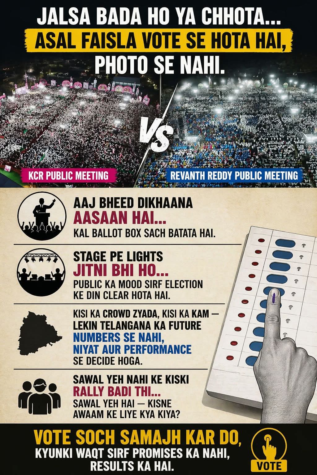 Rallies loktantra ka ek hissa hain, lekin woh nateeja nahi hain. Jeet usi ki hogi jisne dilon ko jeeta hai, na ki sirf camera ke lens ko. Telangana ka bhavishya wahi tay karenge jo **"shor"** se upar uthkar **"service"** par dhyan dete hain. Aakhir mein, voter ki ungli ka nishan hi sabse badi taqat hai.